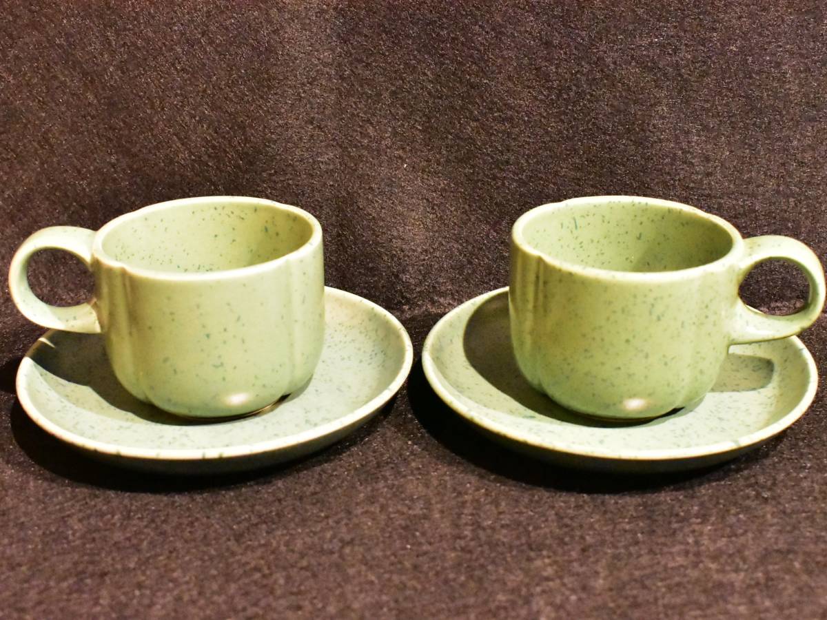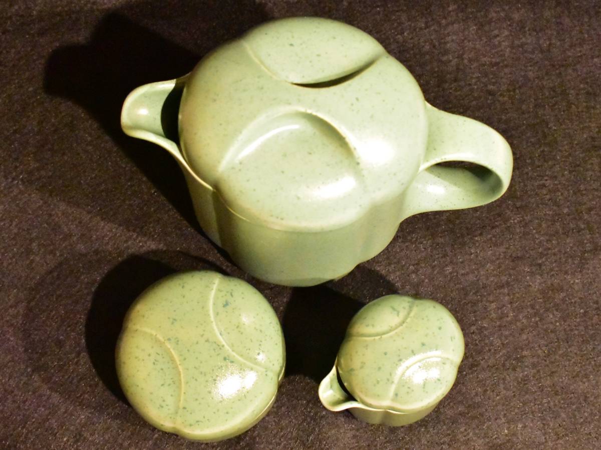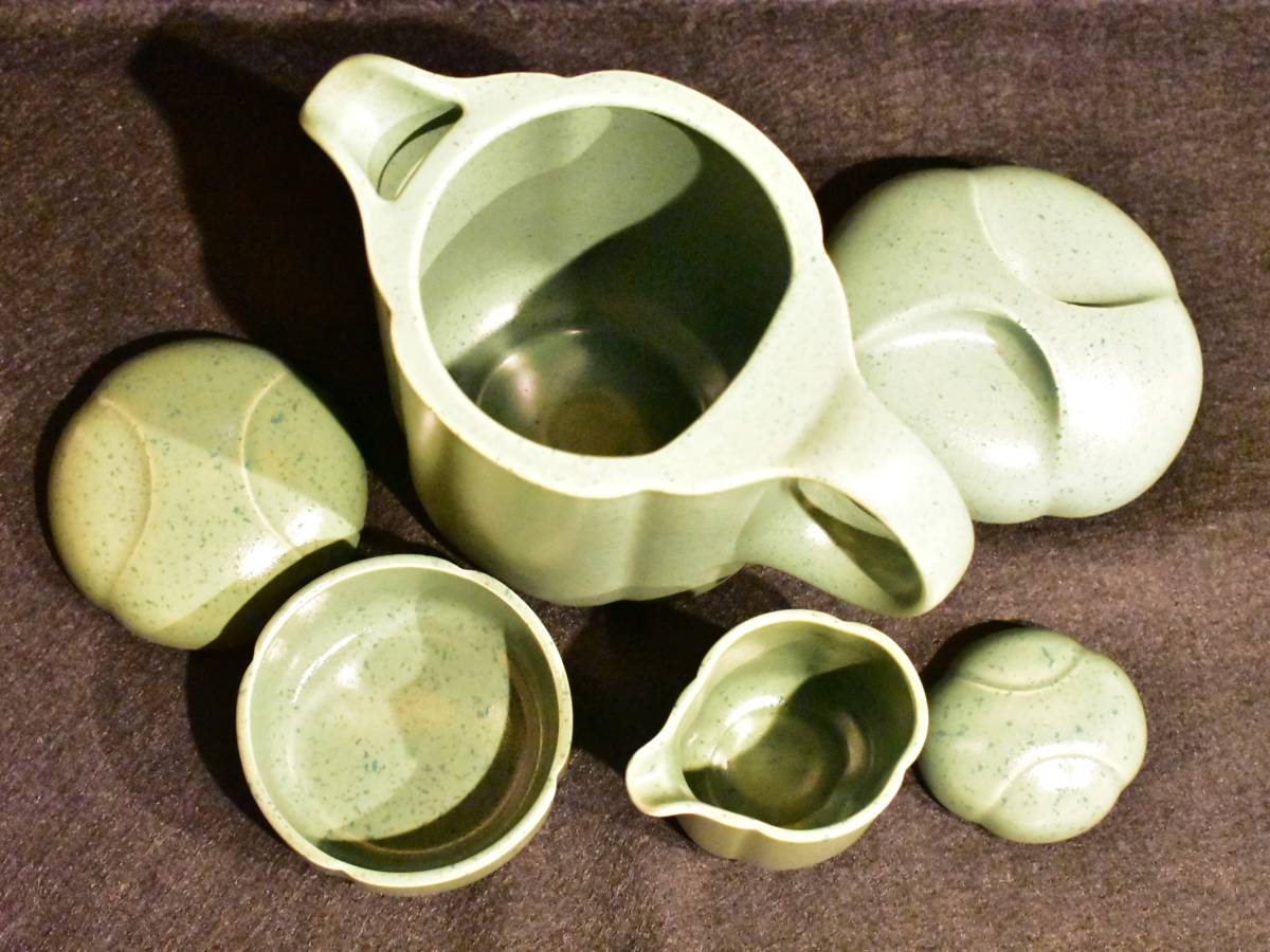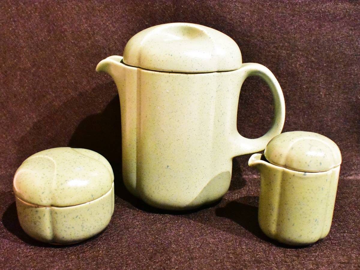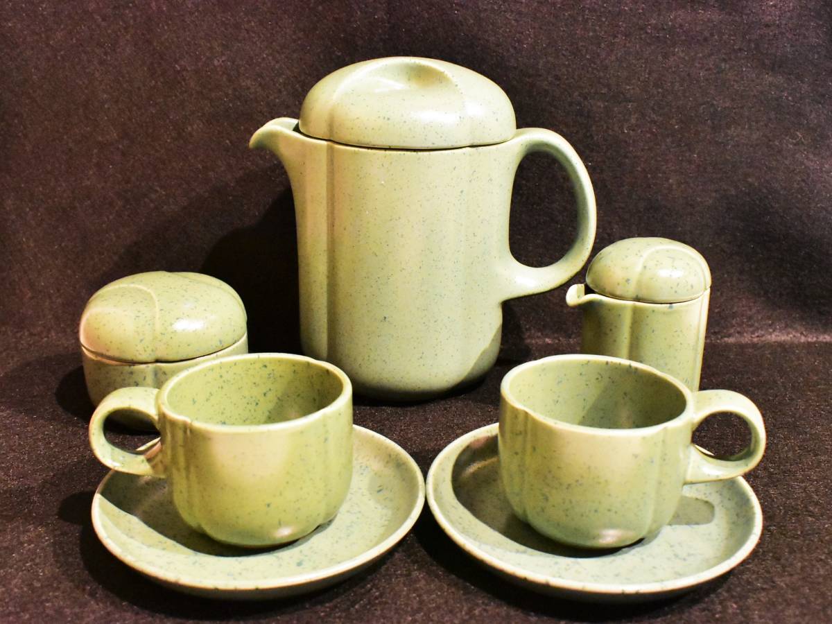 ポット、クリーマー、シュガーポット、カップ&ソーサーx2客の5点がセットになったものです。