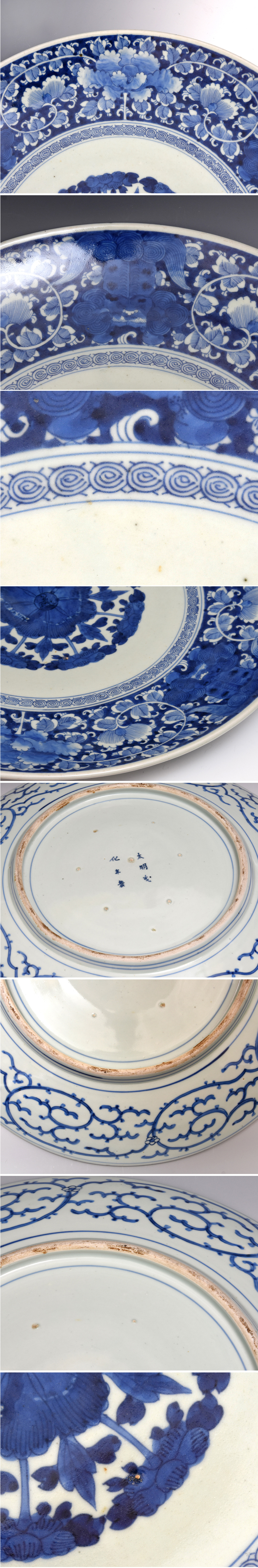 非常に出来の良い大皿です。 見込みに丸形の牡丹が配置され、周りには唐獅子牡丹が繊細に描かれております。 また唐草の部分は白抜きが施され、通常の唐草とは違い“逆蛸”(蛸唐草文様に多い技法の為呼ばれている所以)と呼ばれている、より手間がかかる技法が用いられております。 裏面と比較するとその差は一目瞭然だと思います。 裏面には花唐草が施され、高台内に銘あり。 経年経過しておりますが、大きなキズ等なく良い状態です。 ※撮影の際に生じた写り込みなどがございます。 ご理解の程よろしくお願い致します。 |