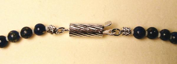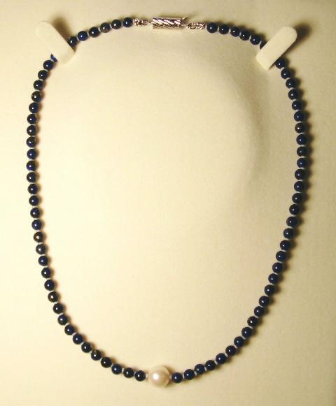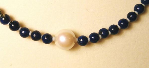 4mmのラピスラズリのネックレスに、大きめのパールがセンターにセットされていて、これがラピスの細いネックレスにぴったりのバランスになっています。