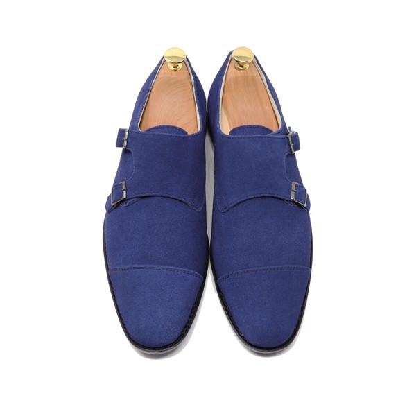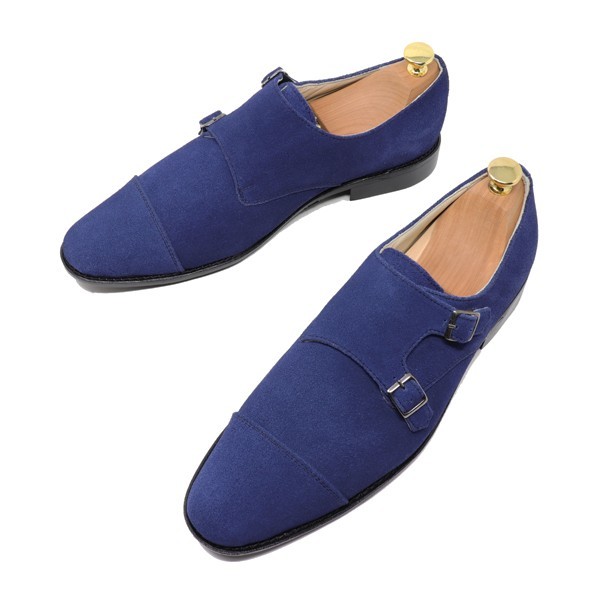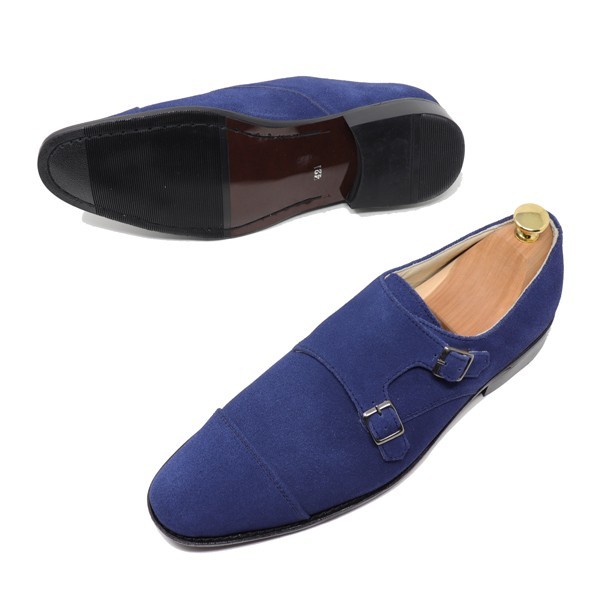 28.5㎝☆ハンドメイド 本革 スエード ダブルモンク ストラップ ビジネスシューズ カジュアル マッケイ製法 ネイビー S301