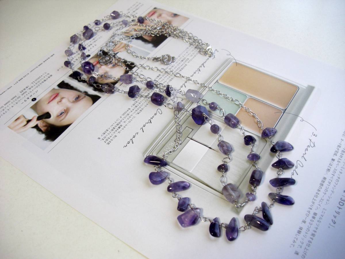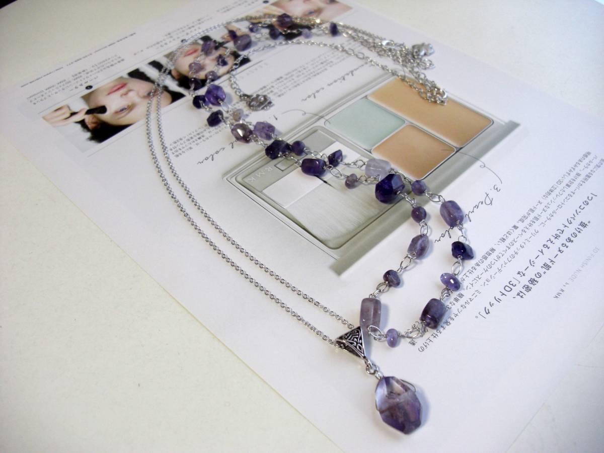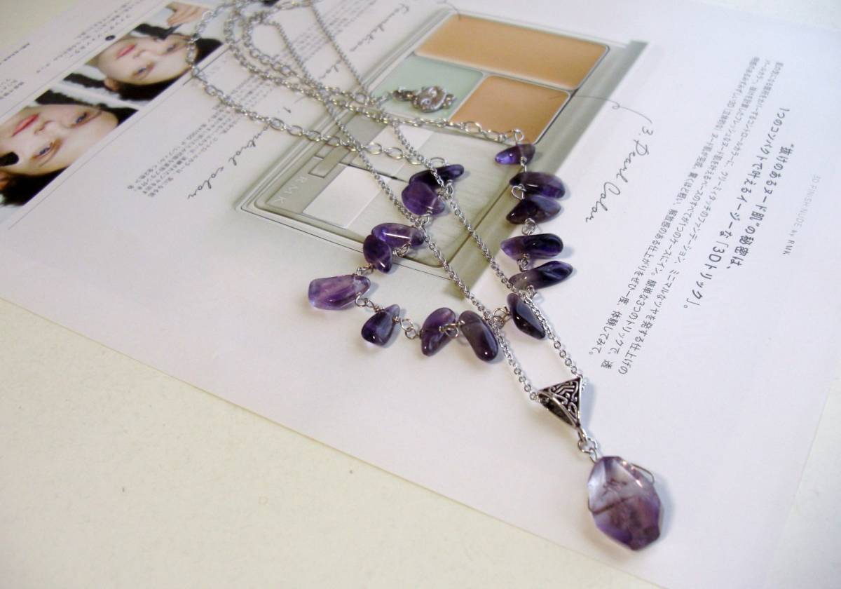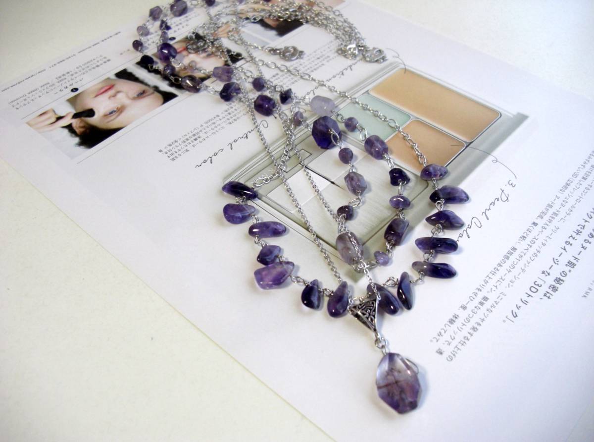 ロマンチックを追いかけて・・シリーズです♪アメジストの魔法・・繊細なアメジストのネックレス3本セットです♪いろいろな組み合わせで楽しんで頂 けます♪それぞれ単品や2本セットでも出品しています♪6ミリから14ミリ位までのミニタンブルやラフカット、ラウンドカット、ナツメなどのデザイン違いのアメジストを紡いだネックレスは長さ106センチ位で調節自由です♪2連にされても素敵です♪12ミリから14ミリ位までのペダル型のアメジストは合わせやすいシンプルなデザインです♪長さは全長80センチ位で調節自由です♪シックな座金と華奢なチェーンに合わせた20×15ミリ位のラフカットのアメジストは神秘的な透明感が素敵です♪長さは77センチ+アジャスター13センチで最長90センチ位です♪トップは4センチ位です♪3本ともシンプルなデザインなので長く着けて頂けると思います♪♪ハンドメイドをご理解頂いてノー クレーム、ノーリターンでお願いします