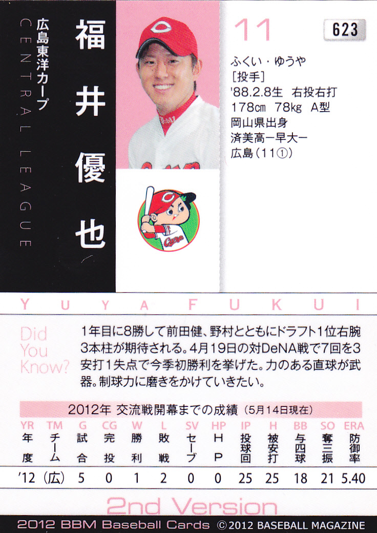 BBMベースボールカード 2012-2nd 623 福井優也 岡山県 済美高校 早稲田 ドラフト1位 広島東洋カープ