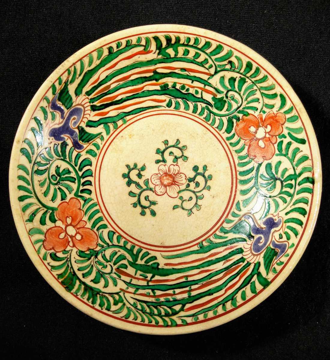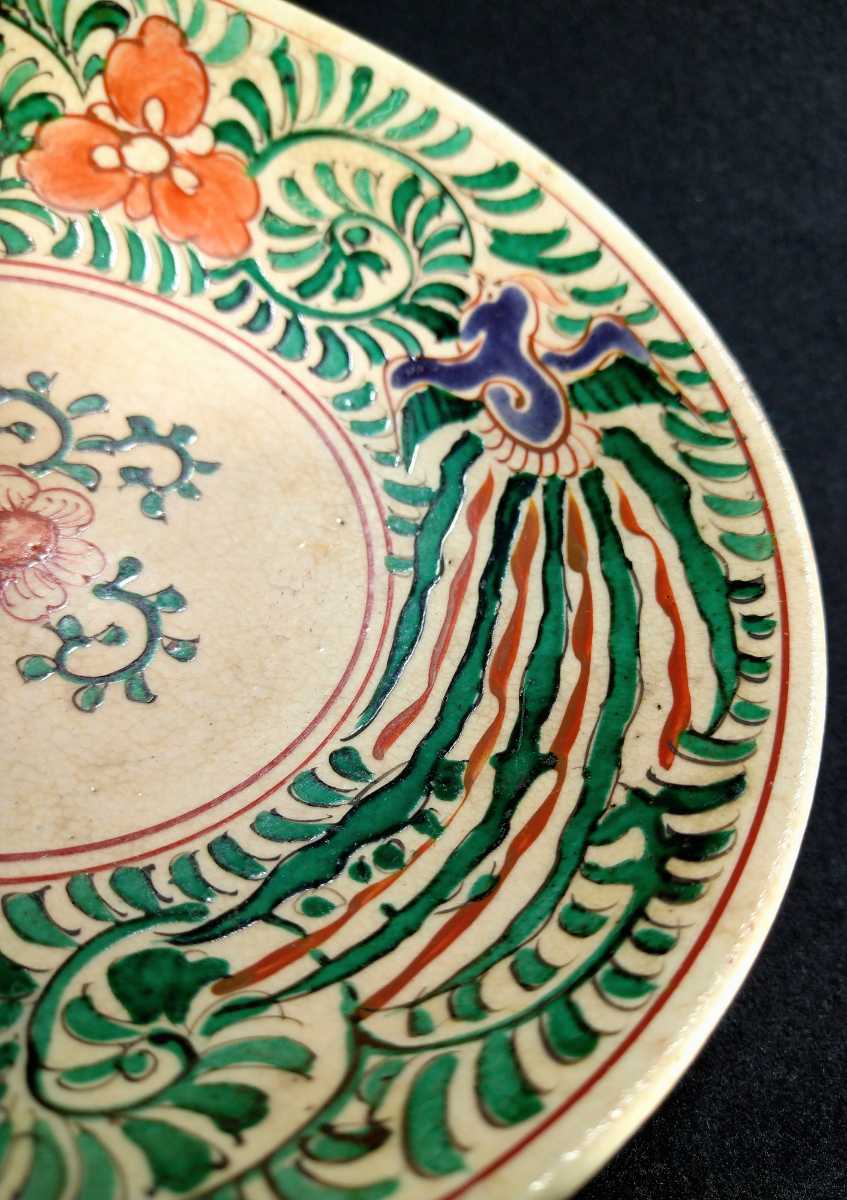 美しい唐草文のなかを優雅に鳳凰が舞う上品な三彩手の菓子器でございます。