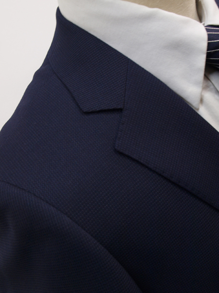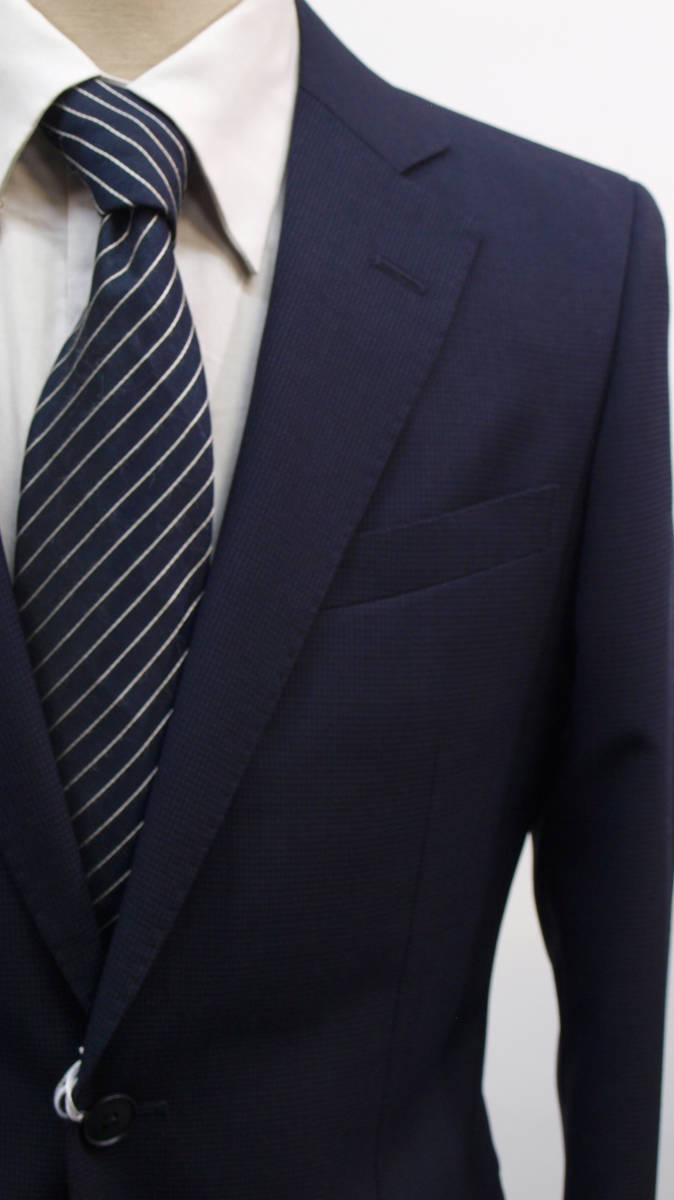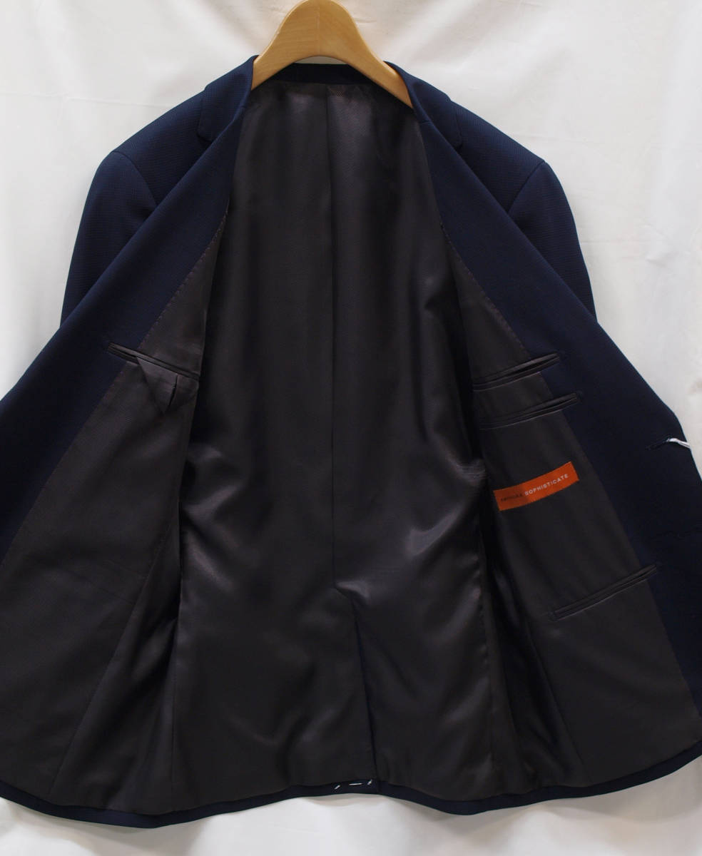 【サイズ】 BB4 (BBS BE4 サイズ相当) 目安の体型 身長160cm~170cm、ウエストサイズ92cm前後 【ジャケット実寸】 肩幅46cm 着丈66.5cm 袖丈58cm 脇下部分52cm 身幅48cm 【パンツ実寸】 ウエスト(胴回り実寸)92cm (平置きでかるくはかると92cmでひっぱってはかると94cmです。股上が浅いため2~3cmほど実寸が大きくなります。) わたり幅32.5cm(股下10cmの部位で29cm) 裾幅19.8cm 脇股上23.5cm 前股上26.5cm 股下88cm(裾上げしていない状態/新品) 【素材】 表地:ウール30% ポリエステル70% 裏地:胴裏/ポリエステル100% 袖裏/ポリエステル100% 秋冬スーツの中ではあまり厚手ではない秋冬向け紳士スーツ用ウールブレンド素材です。 【色】 濃紺色地 【柄】 こまかいピンヘッドストライプ織柄 【デザイン】 コンパクトな印象の細身ですっきりとしたシルエット、タイトフィットスリムスーツ新品、裾上げしていない状態です。 ジャケット:肩パットがはいっておらず軽い着心地のシングル2つボタン、細いシルエットのスリムモデル パンツ:股上は浅く細身シルエットのノータックスリムテーパードパンツ 秋冬商材ですが、それほど厚手ではない素材でご着用の地域にもよりますが夏を除くほぼオールシーズン対応商品です。 【縫製仕様】 ・ジャケットはシングル2つボタン、ノッチドラペル、襟縁等AMFステッチ入り、袖口ボタン4つ、センターベント、内ポケット4つ(小ポケット2つ含む)、総裏(秋冬春物) ・パンツはノータック、膝裏当て付き、脇ポケット斜め付け、後ろポケット両玉縁で左のみボタン付き、フロントはファスナーでボタン&ホック仕様/うちかけボタンあり、 細部にわたりきちんとしたビジネス仕様のきれいな縫製仕立てで仕上がっております。