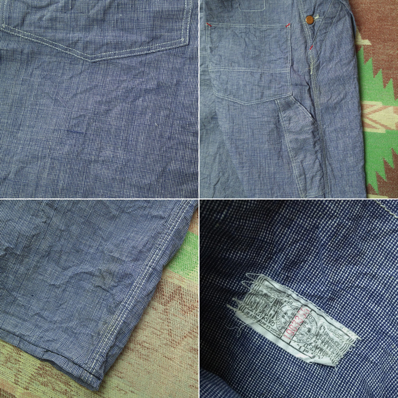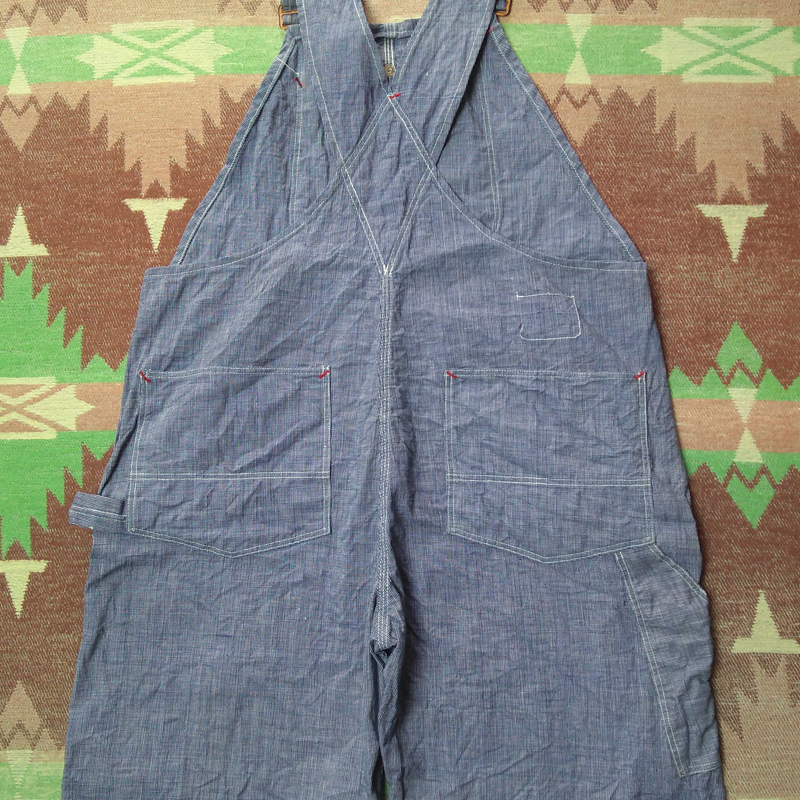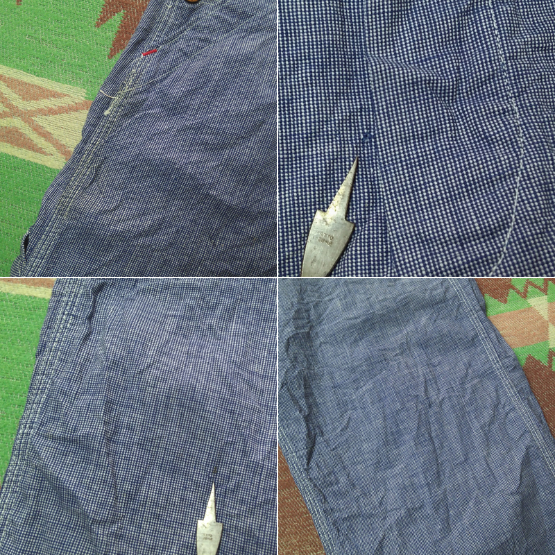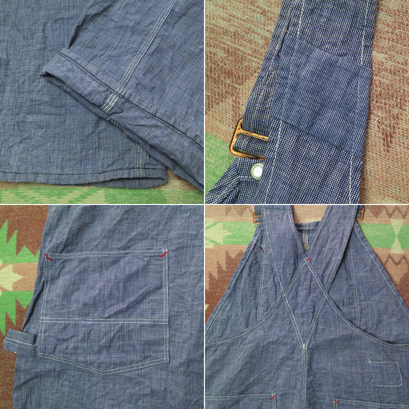 左サスペンダーにダメージがあったためリペアしてあります。復刻物ですがピンチェックの生地を使用し違和感少なく仕上がっていると思います。同じモデルのオーバーオールを複数同時に入手したうち、リペアがない個体よりも1万円ほど安くしていますので、気にせず着られる方にはオススメします。