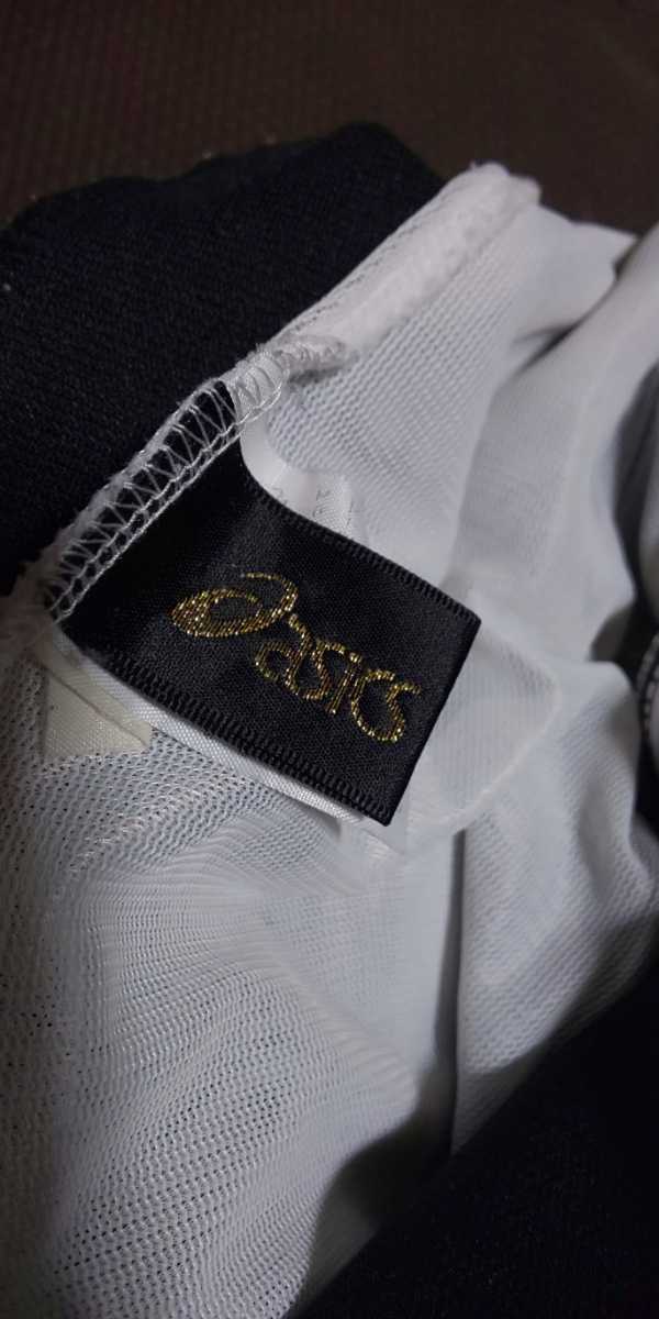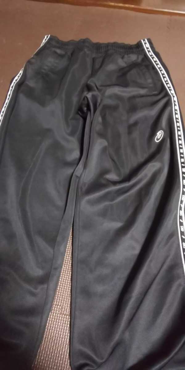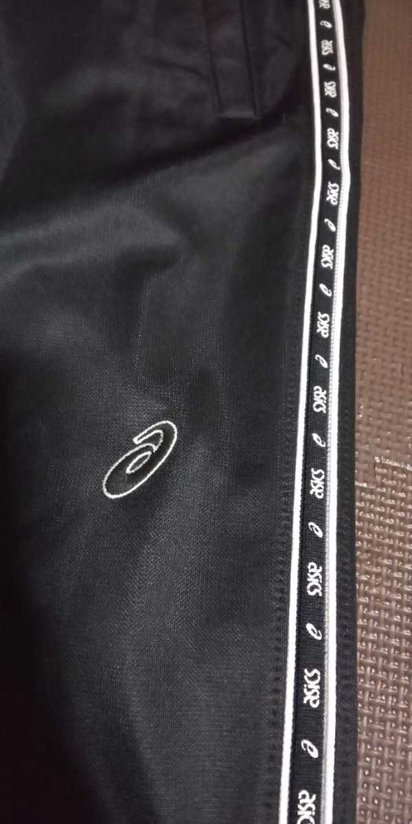 ASICS黒、ラインロゴ入りストレッチパンツ