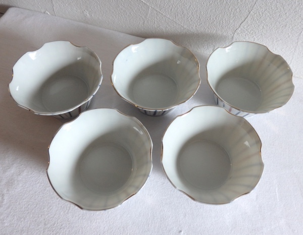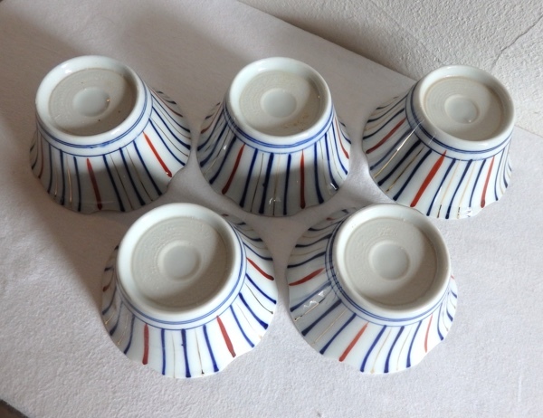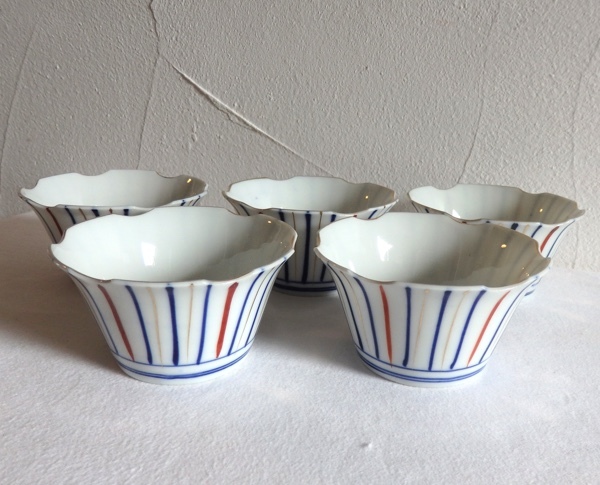 昭和 レトロ かわいい 小鉢 輪花 縦ボーダー 赤 青 金彩 5個セット 美品です。