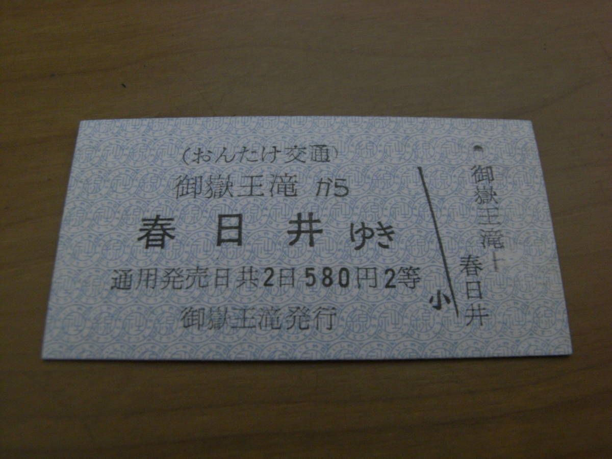 おんたけ交通国鉄連絡乗車券 御嶽王滝から春日井ゆき 580円 2等 御嶽王滝発行