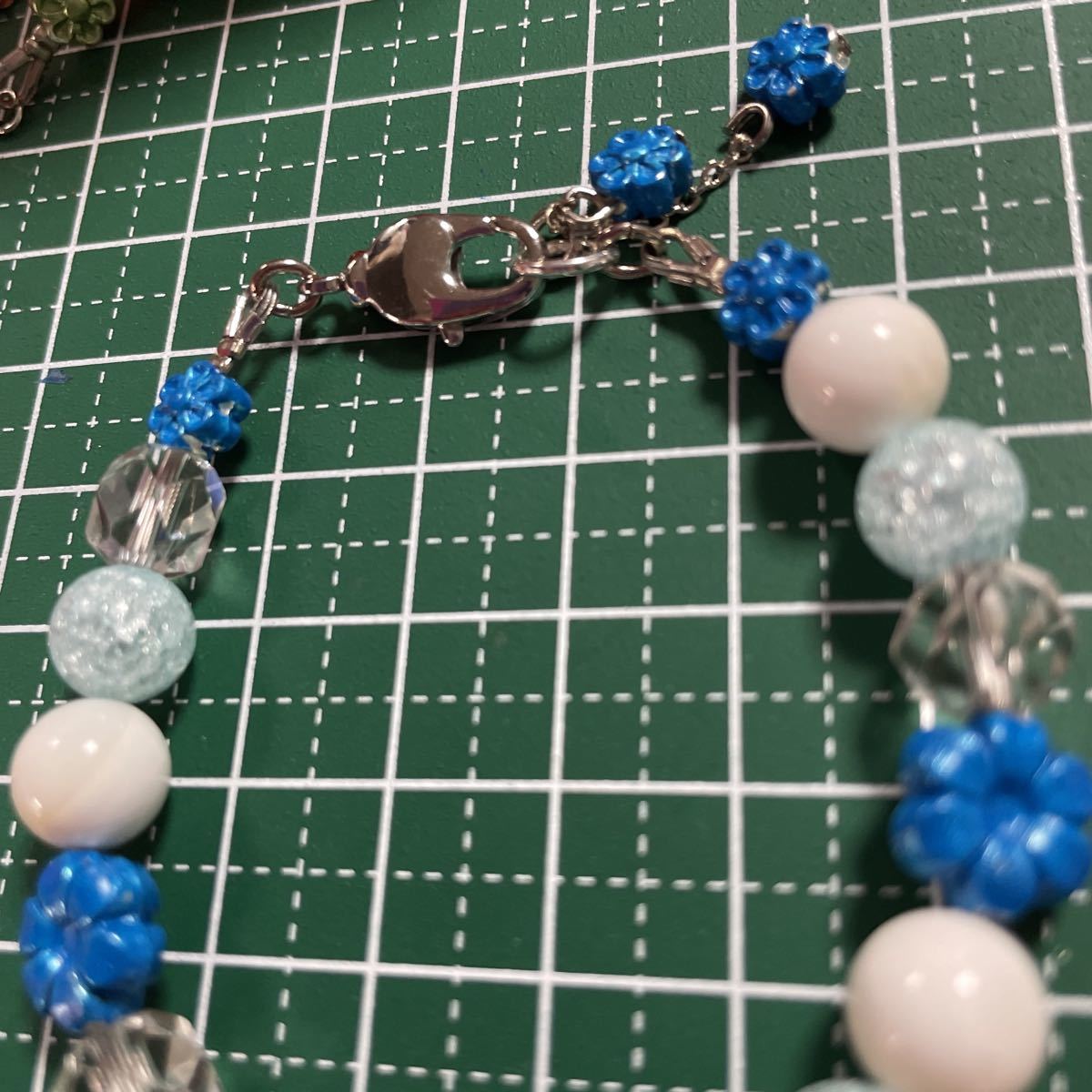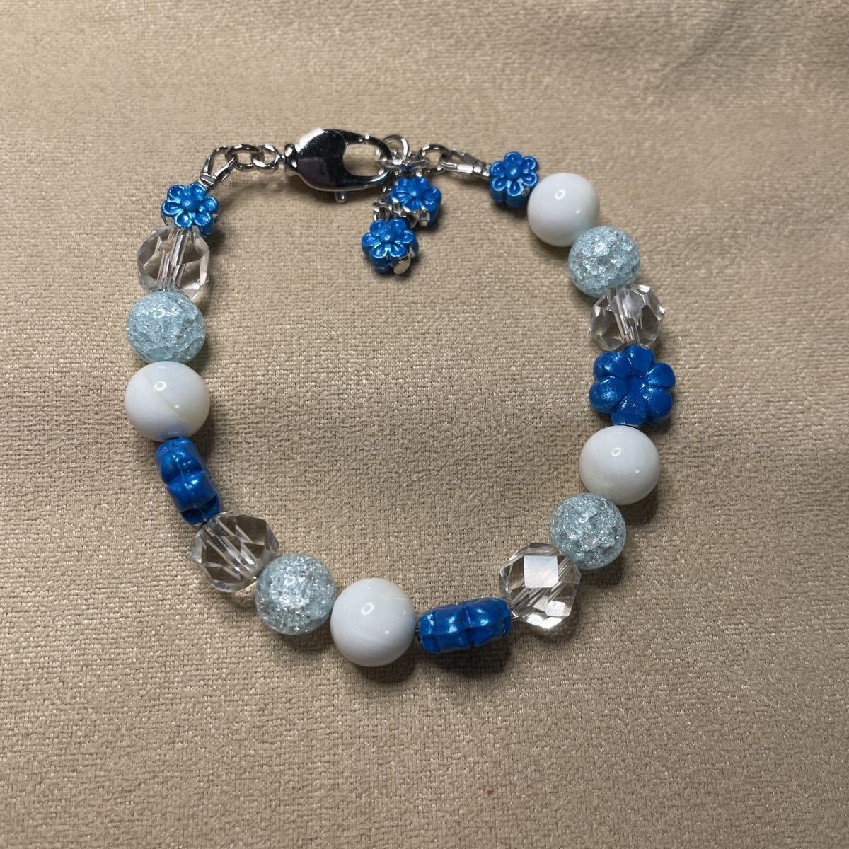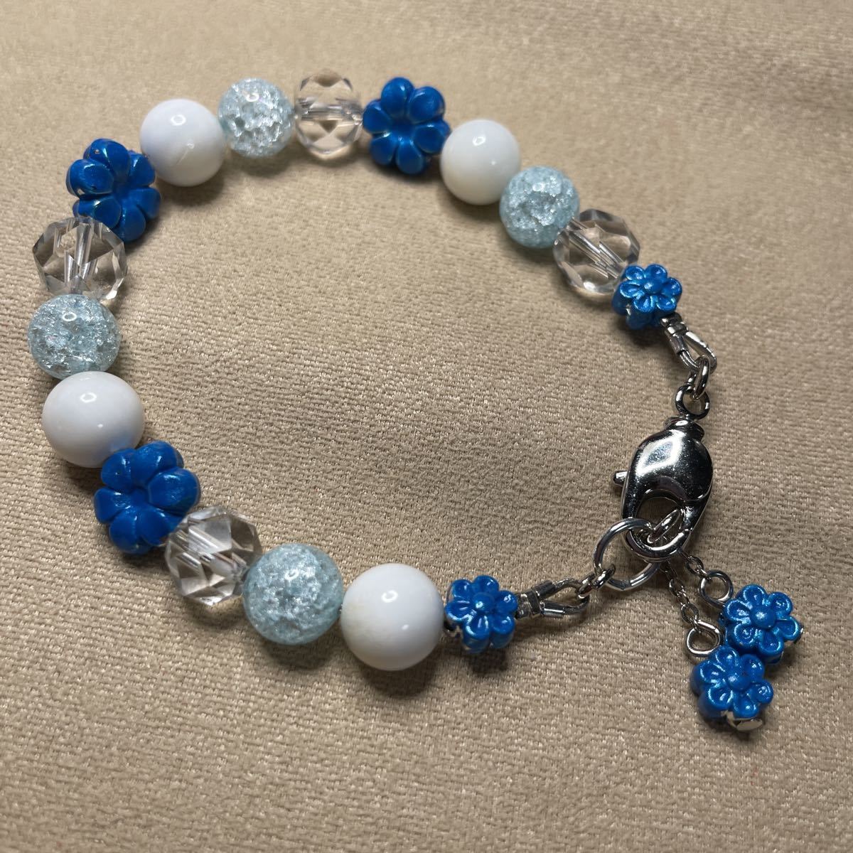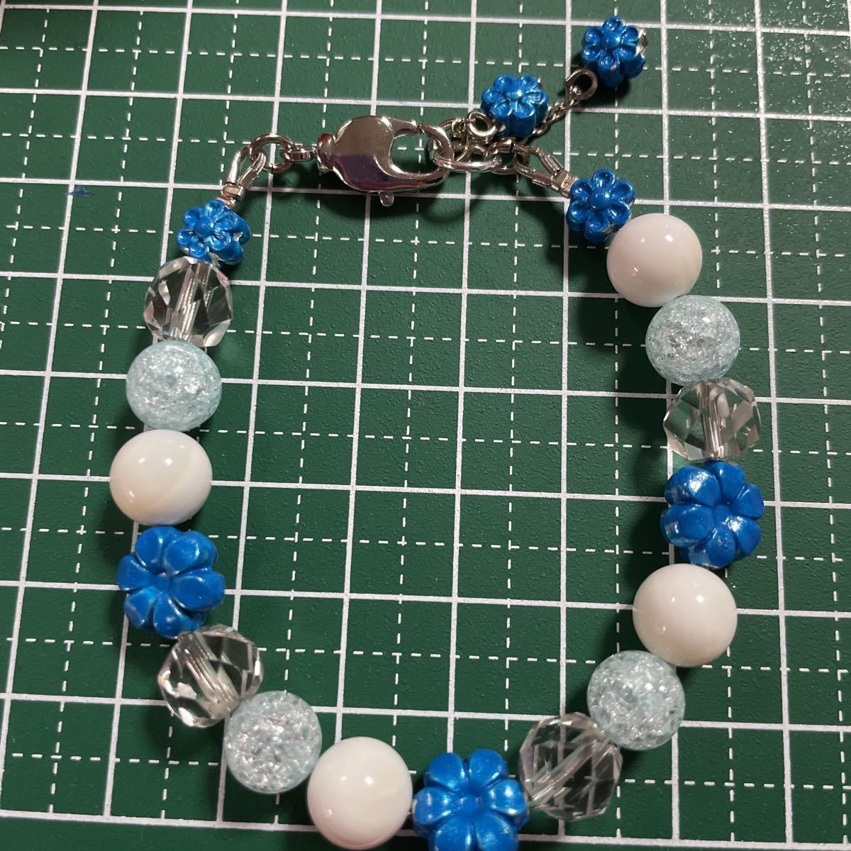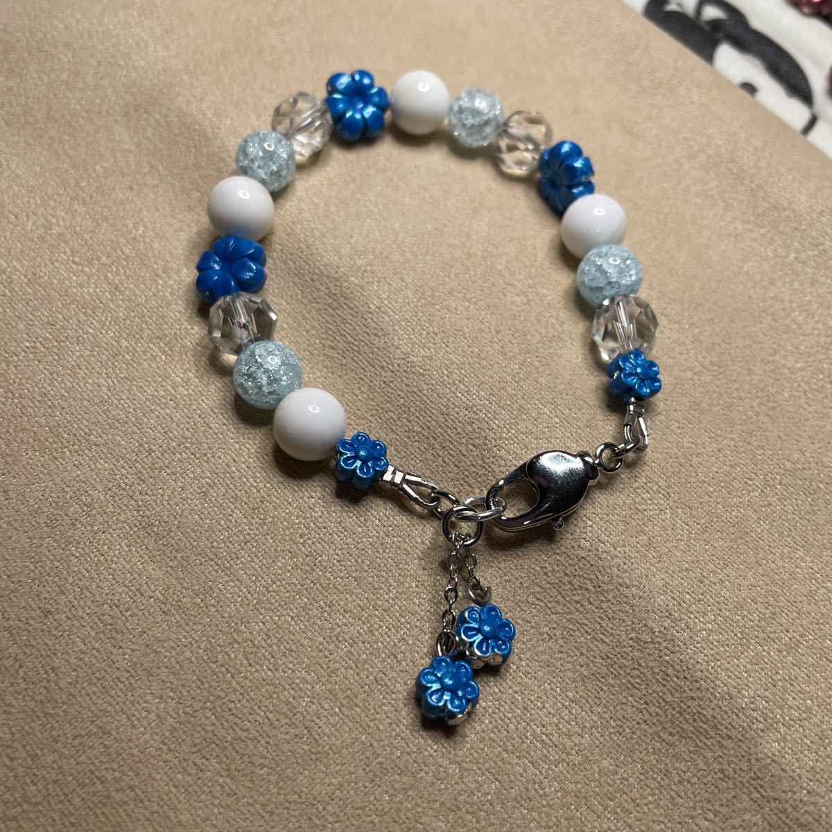 8ミリの玉使用しております。綺麗なクラック水量とキラキラカット水晶とマザーオブパールを合わせてブルーのお花つけました。とても涼しげです。留め金付近のパーツを持ってつけ外ししていただくとやりやすいです。留め金回転式ですのでとてもつけ外ししやすいです