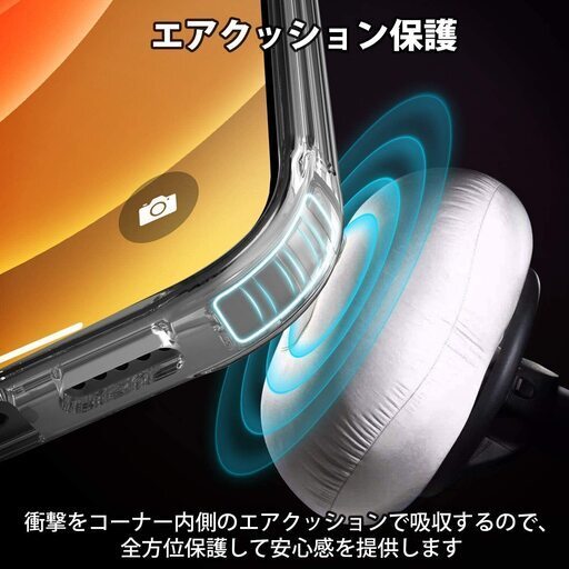 ケースの各コーナー内側に、落下時の衝撃を効率よく吸収する為の技術、エアクッションを採用しております。衝撃をコーナー内側のエアクッションで吸収するので、全方位保護して安心感を提供します。
