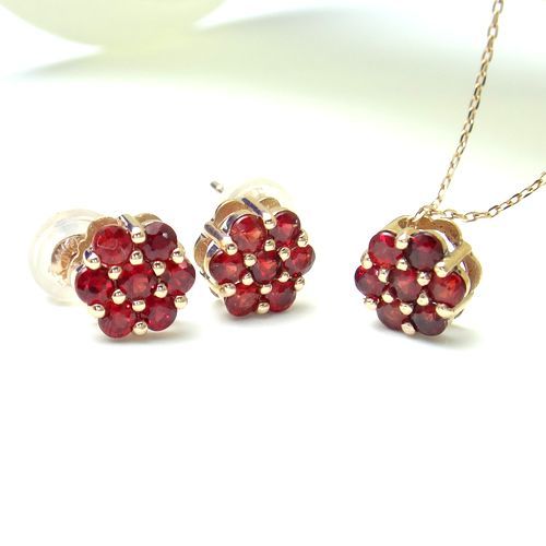 真っ赤に燃えるようなレッドオレンジサファイアのフラワーデザインのピアスとペンダントネックレスのセットです!