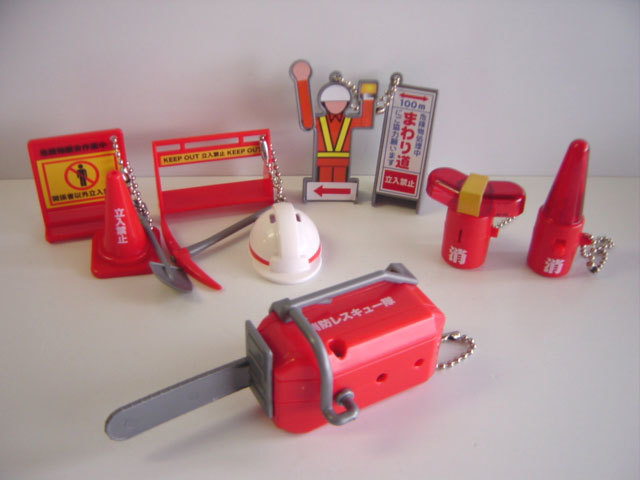 1.人型看板セット 2.ヘルメットセット 3.三角コーンセット 4.三角コーンライト(LEDが点滅) 5.消防ライト(LEDが点滅) 6.チェーンソー(振動モーター内蔵) ◇真っ赤な色がカッコイイ!! 消防隊のアイテムをストラップにしました! |