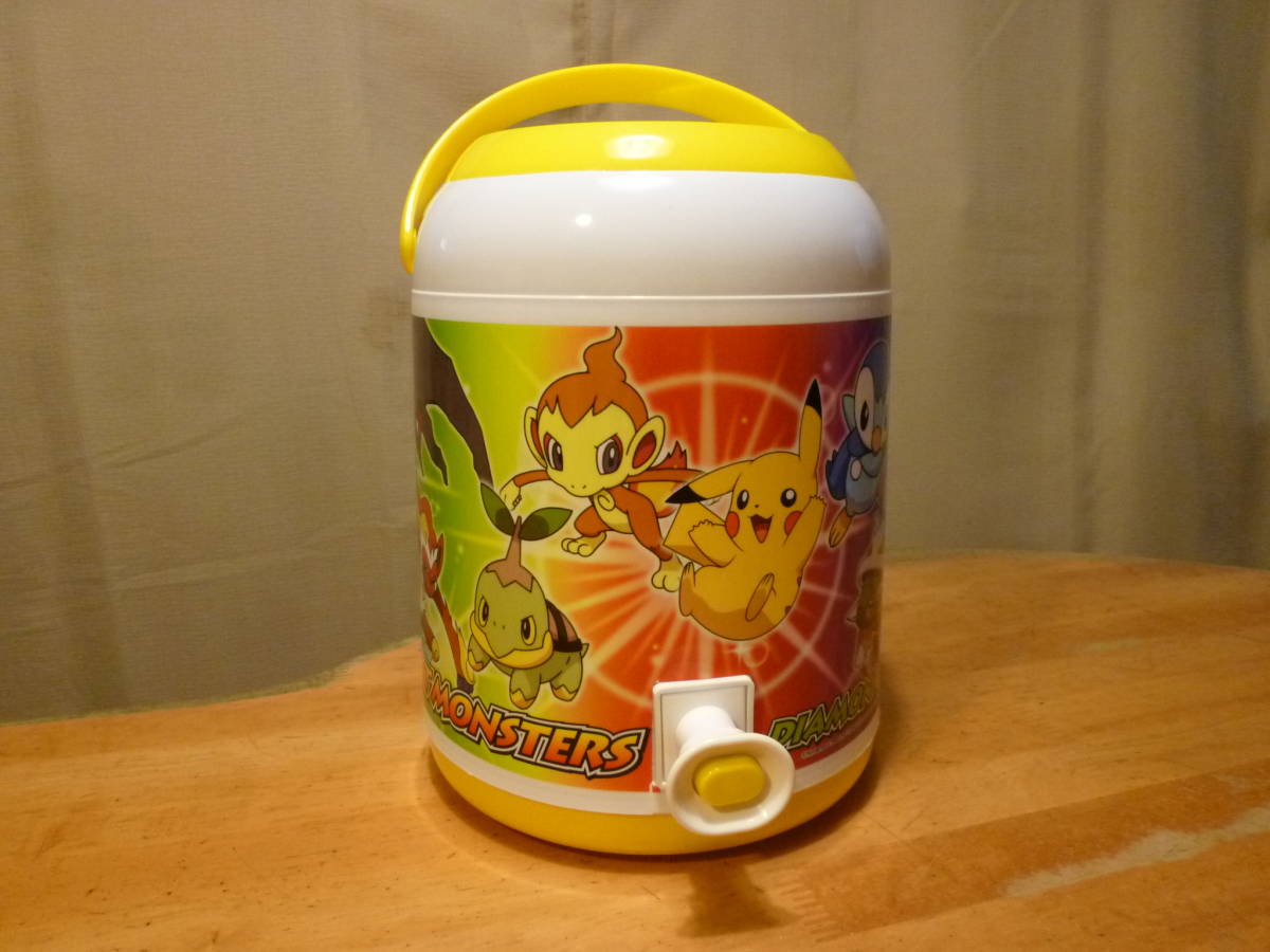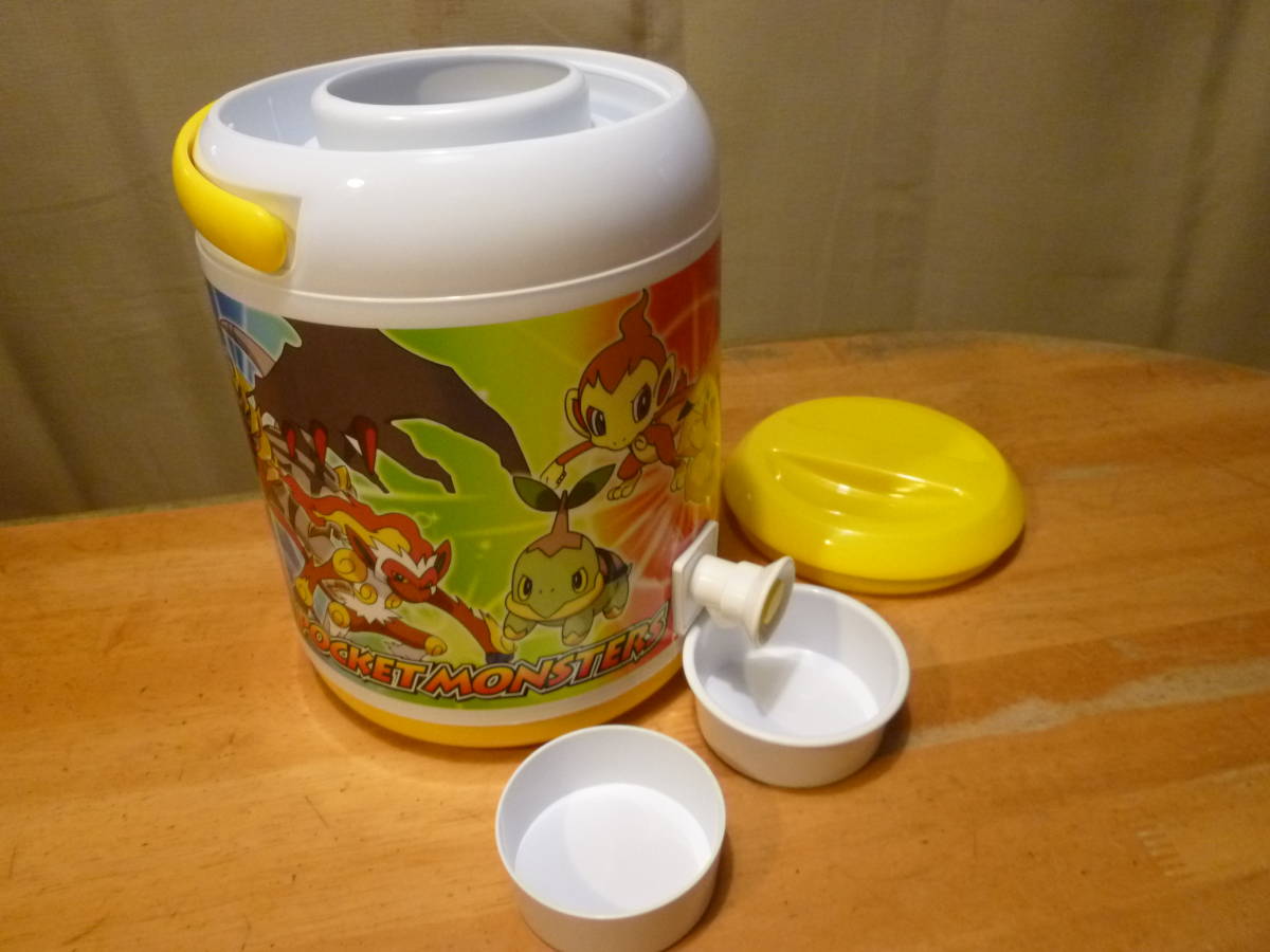 こちらはお子様が大好きなポケットモンスターで、その家庭用のウオータージャー?の様です。周囲はおなじみのキャラクター達が楽しそうにプリントされ、内部は2重?の構造の様な感じです。フタを開けると入口にカップが2重にセットされ、取り出し口にそのまま置いてボタンでジャーと出来る様ですが、保温や保冷が出来るものかははっきりしません。