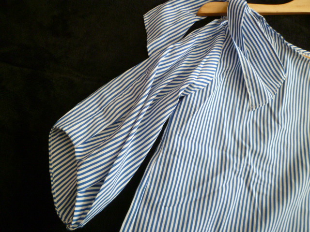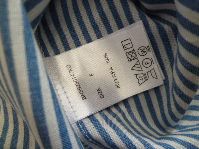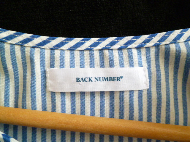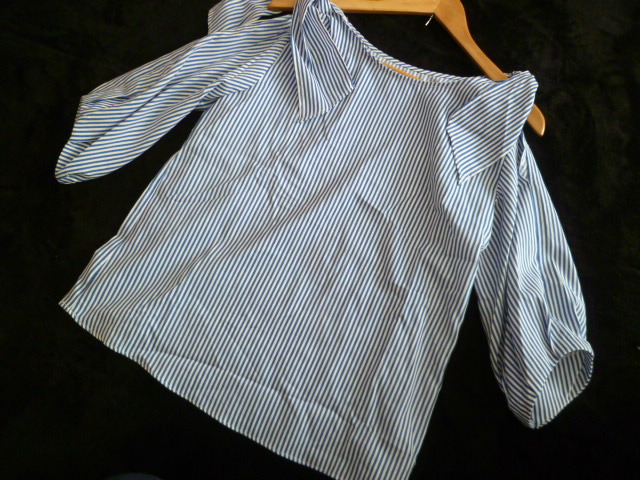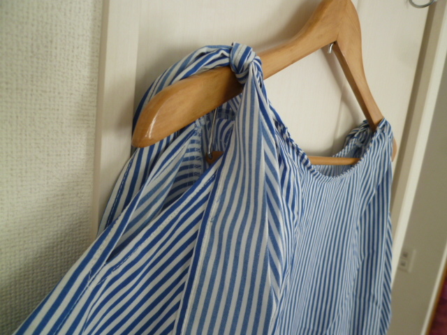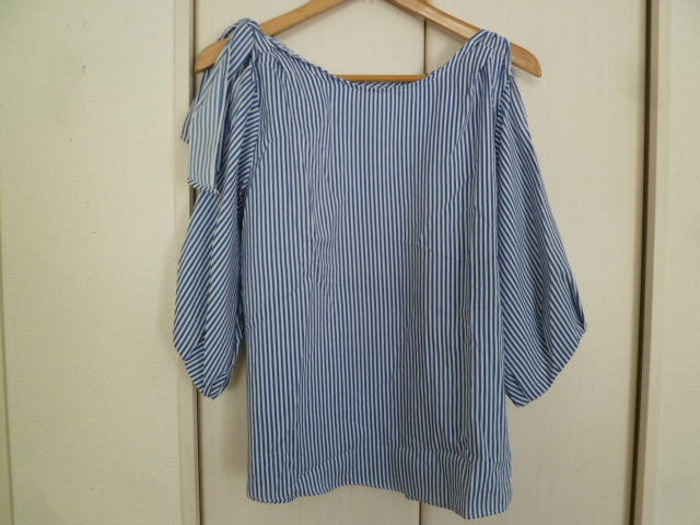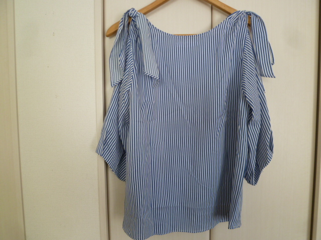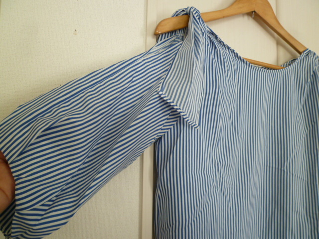 BACK NUMBER/バックナンバー△白×ブルー系縦ストライプ肩リボン肩抜き肩みせブラウスカットソーF/バルーン袖ポワン袖ホワイト△T415
