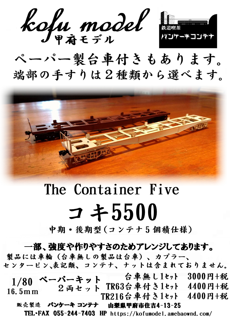 1/80のコキ5500 (5個積み) TR63台車付き2両セットのレーザー切り抜き済みペーパーキットです。