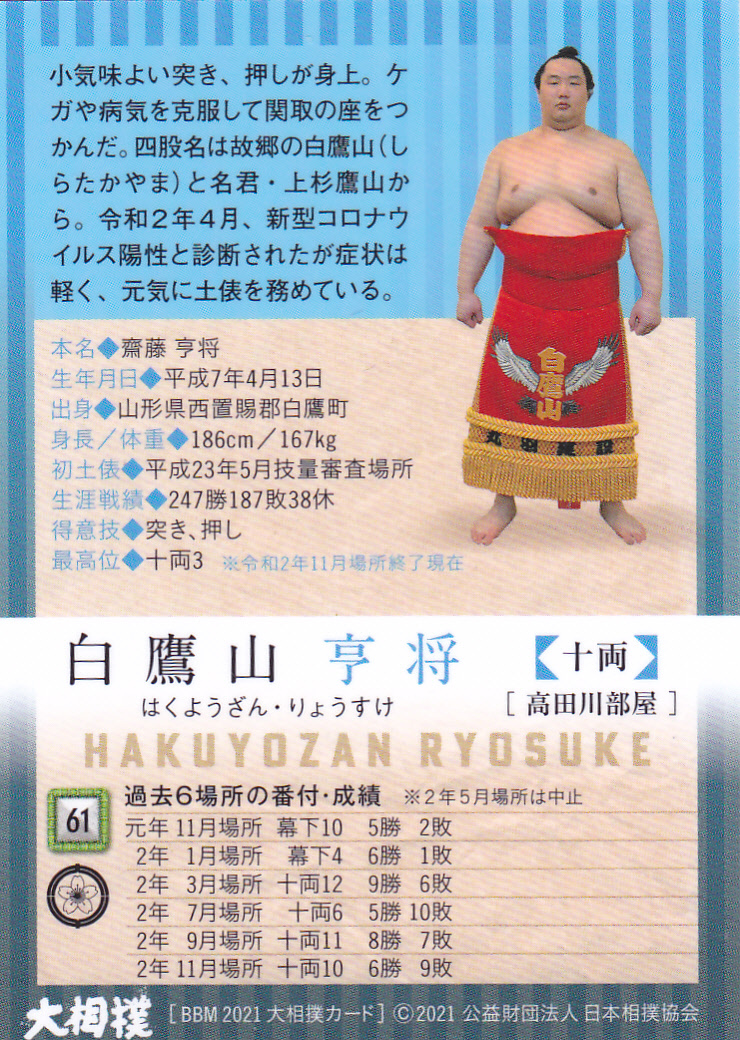 BBM2021大相撲カード 61 白鷹山 高田川部屋 十両 山形県西置賜郡白鷹町