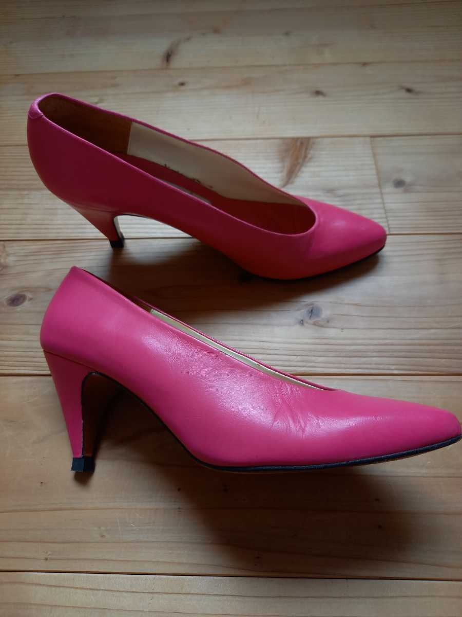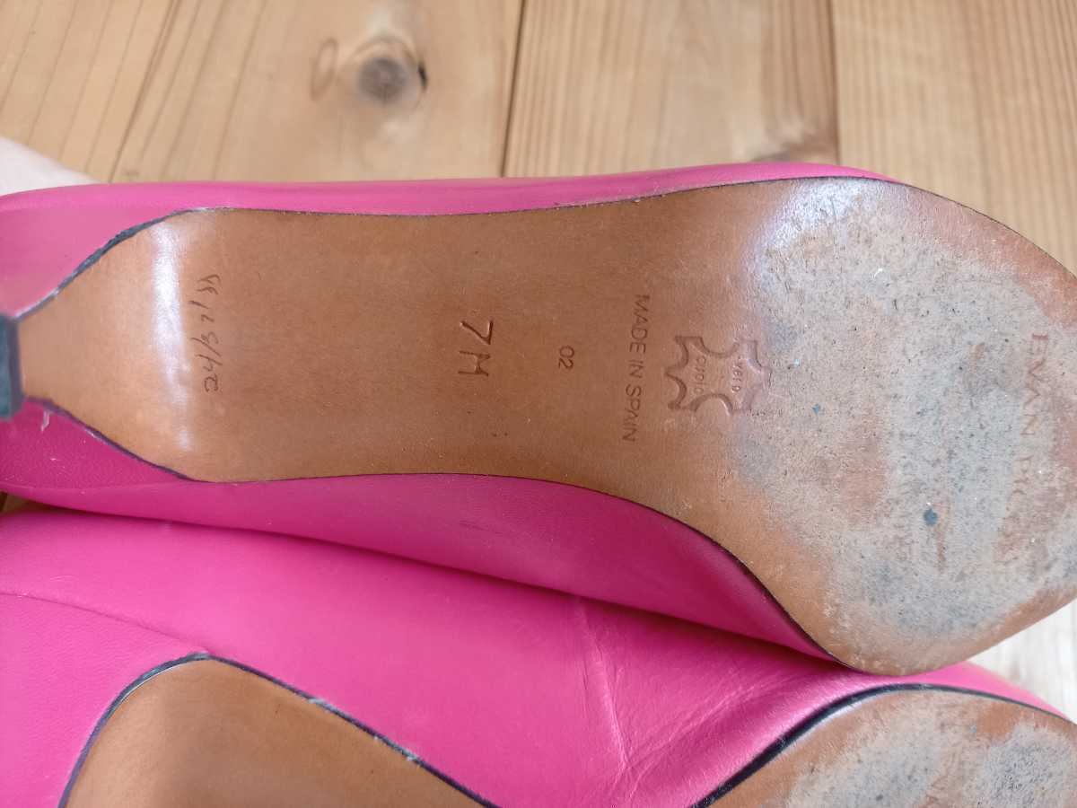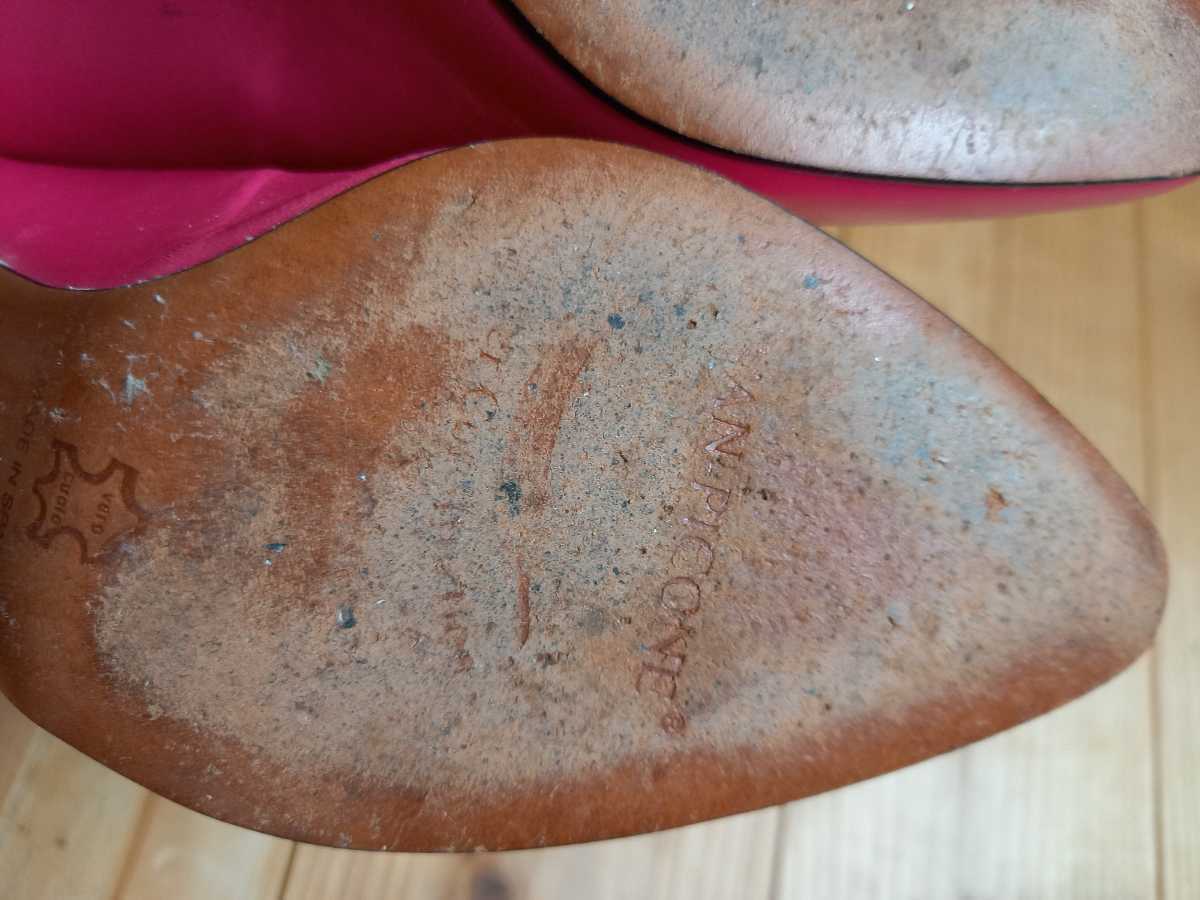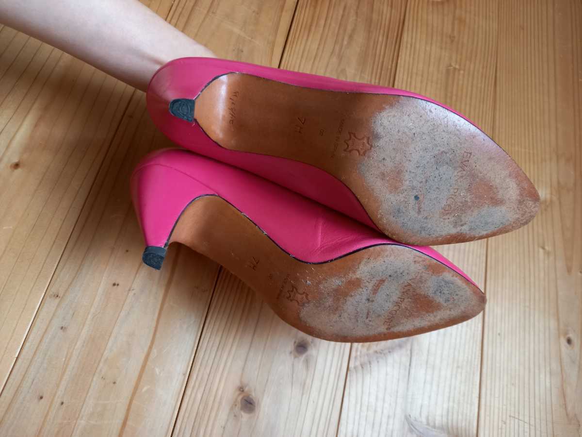 レザーの仕様に高級感があり、レザーのソール(サイドから見た時に厚みがなく品があります)やバナナヒール、スペイン製のハンドメイド(踵の継ぎ目の縫いも見事です)です。