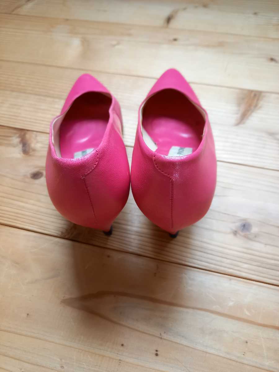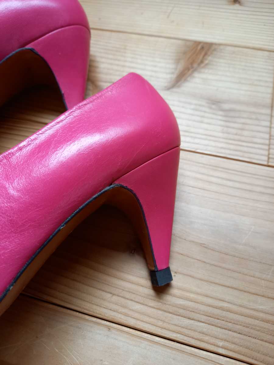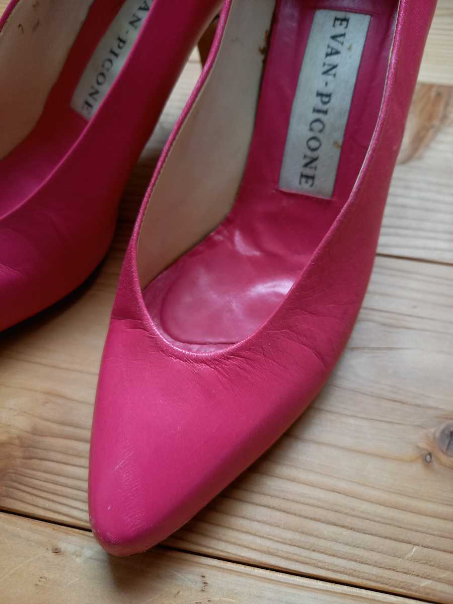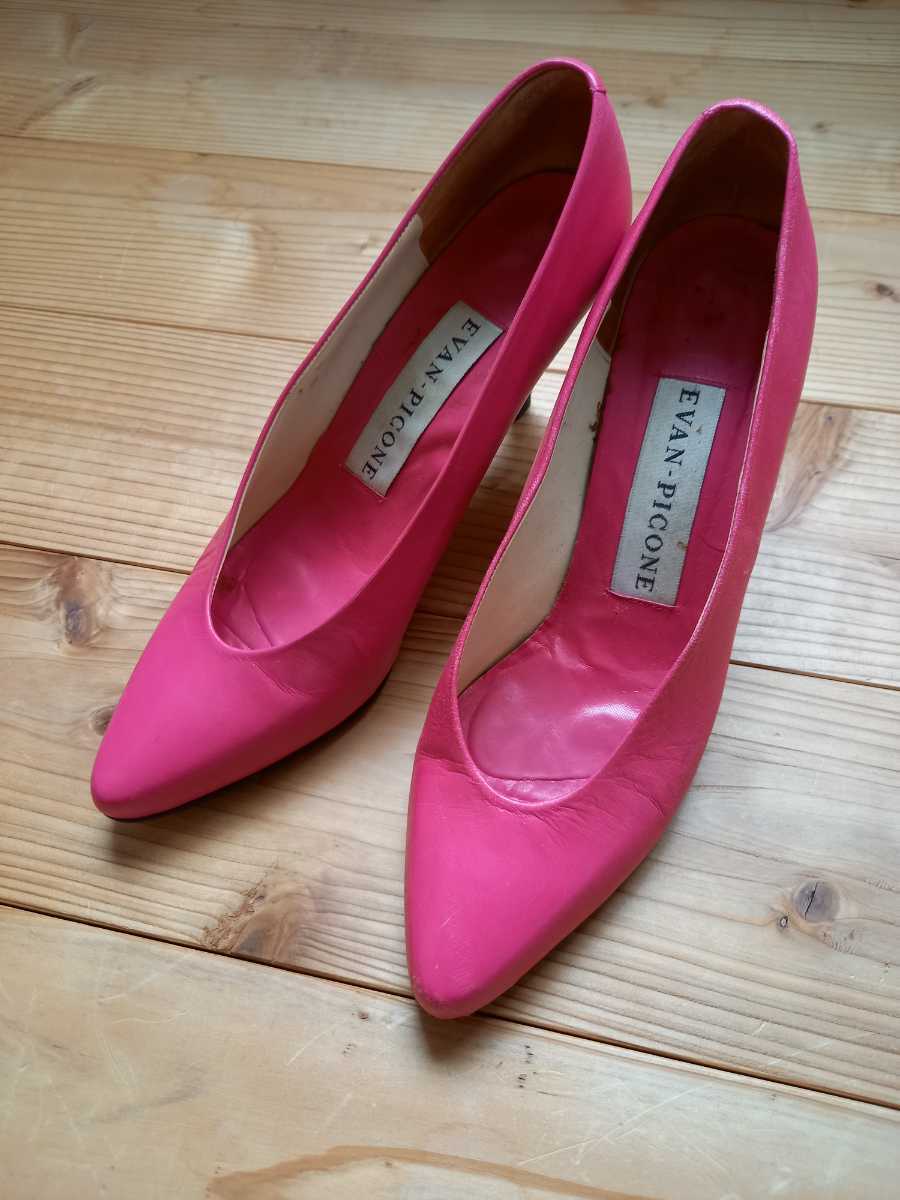 レザーの仕様に高級感があり、レザーのソール(サイドから見た時に厚みがなく品があります)やバナナヒール、スペイン製のハンドメイド(踵の継ぎ目の縫いも見事です)です。