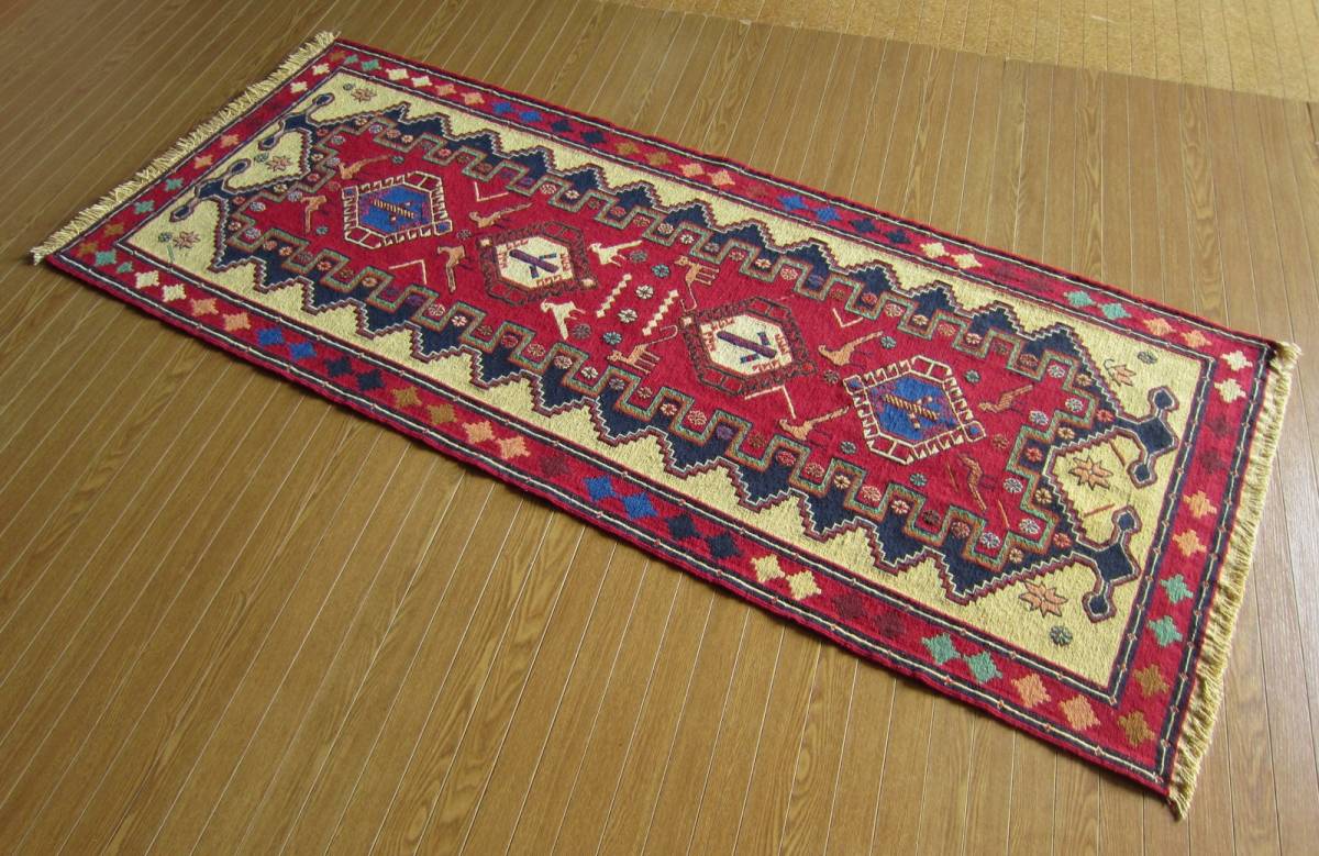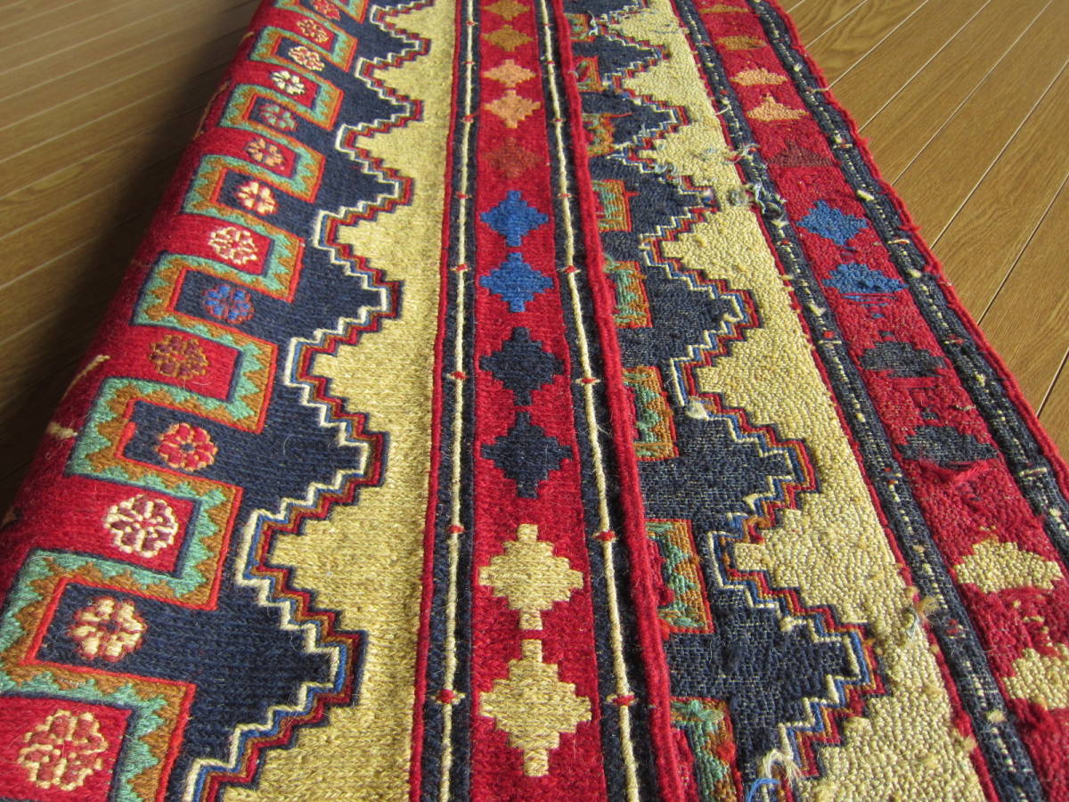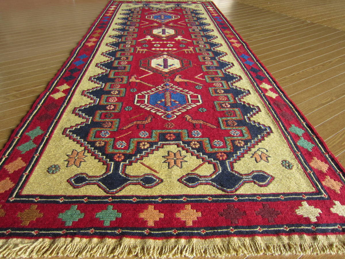 商品説明 | ★素材 : ウール・手織り・スマック織り ※スマック織りとは、イランのキリムの織り方の技法です。 土台の縦糸と横糸の上にもう一本横糸を絡めるように 巻き込んで織っていく高度なテクニックで、 刺繍のように細かな文様を描けることができます。 スマック織りは裏面に模様の糸を渡してあるので 片面使いのキリムになります。 ★サイズ : 約 193×82 cm (房を含まない長さです) ★産地 : イラン・アゼルバイジャン ★状態 : 新品 kxpgs342+ZIBACARPET絨毯 kxpgs342+ZIBACARPET取扱いペルシャ絨毯 FARSHEZIBA_KILIMキリム |