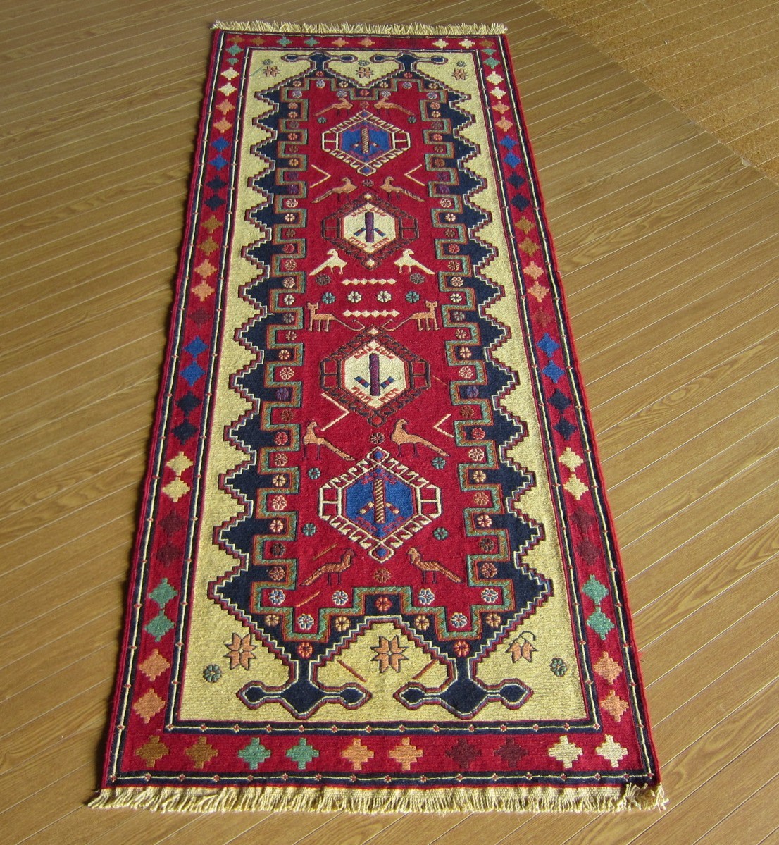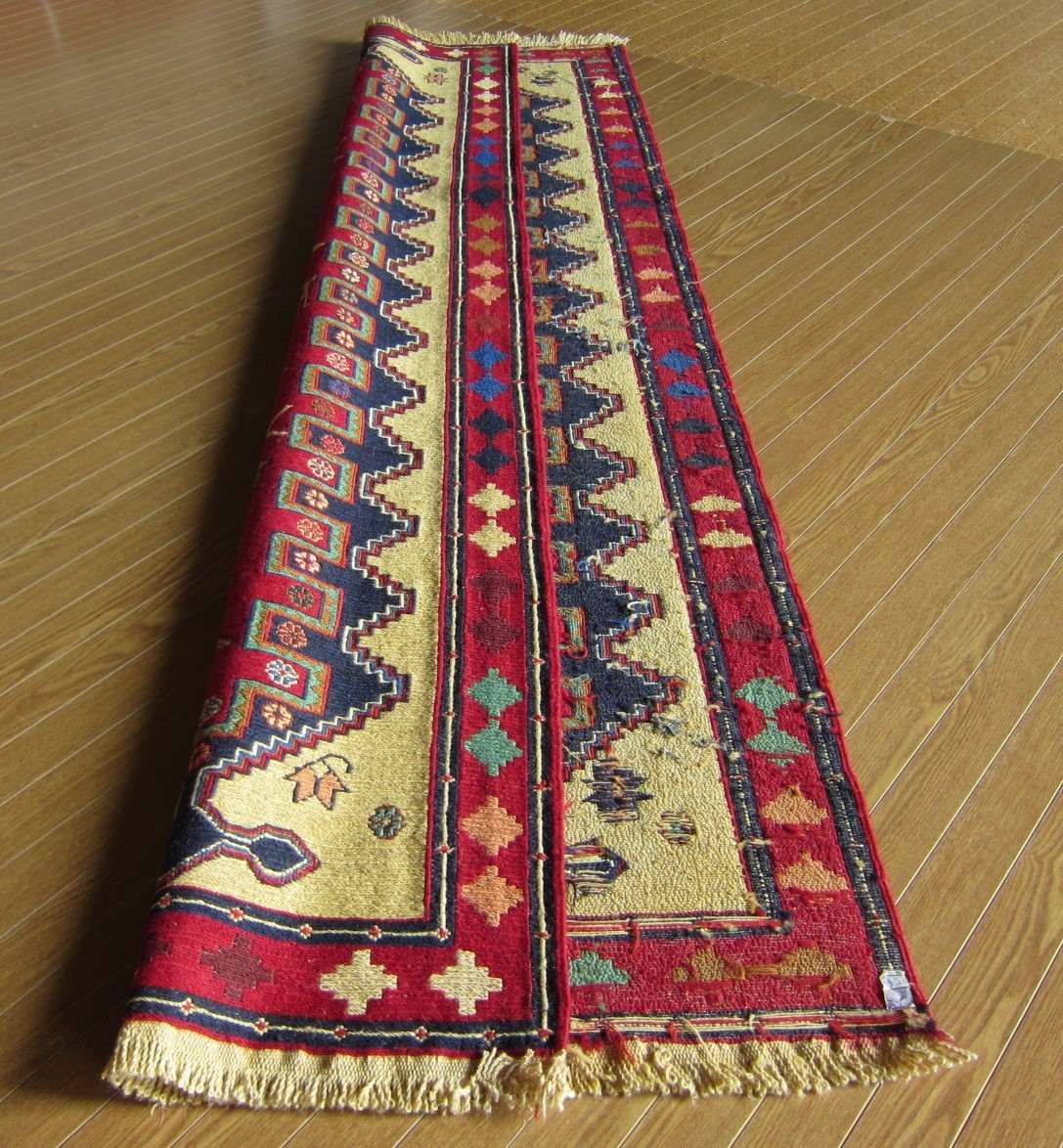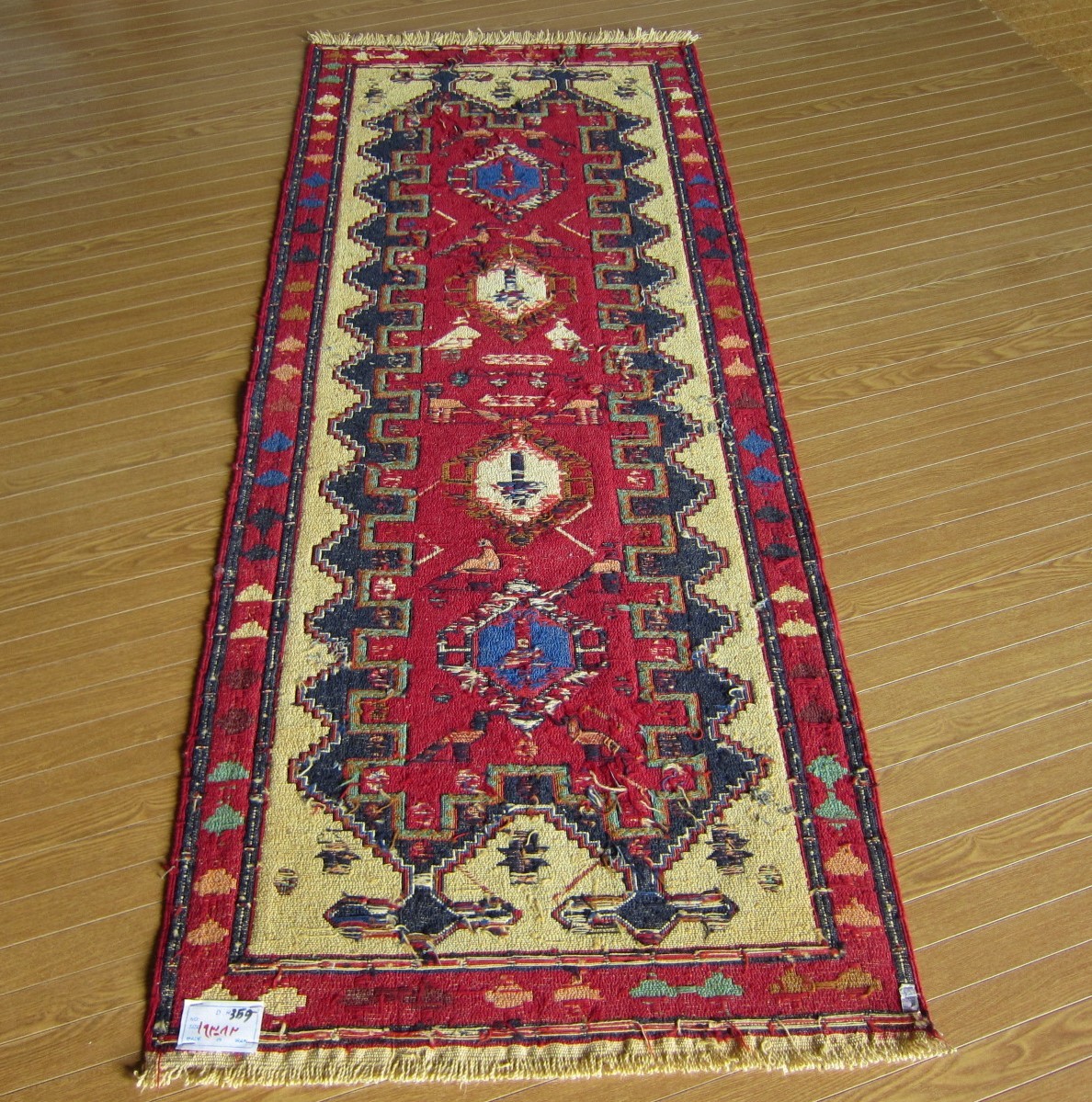 商品説明 | ★素材 : ウール・手織り・スマック織り ※スマック織りとは、イランのキリムの織り方の技法です。 土台の縦糸と横糸の上にもう一本横糸を絡めるように 巻き込んで織っていく高度なテクニックで、 刺繍のように細かな文様を描けることができます。 スマック織りは裏面に模様の糸を渡してあるので 片面使いのキリムになります。 ★サイズ : 約 193×82 cm (房を含まない長さです) ★産地 : イラン・アゼルバイジャン ★状態 : 新品 kxpgs342+ZIBACARPET絨毯 kxpgs342+ZIBACARPET取扱いペルシャ絨毯 FARSHEZIBA_KILIMキリム |