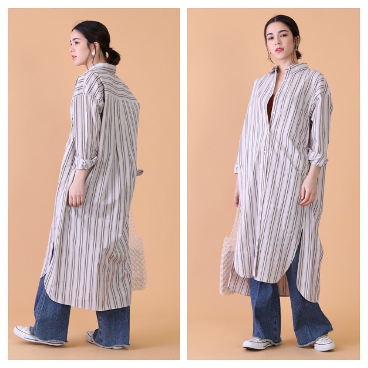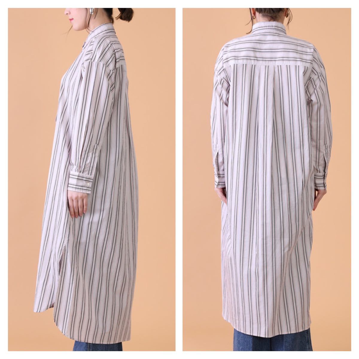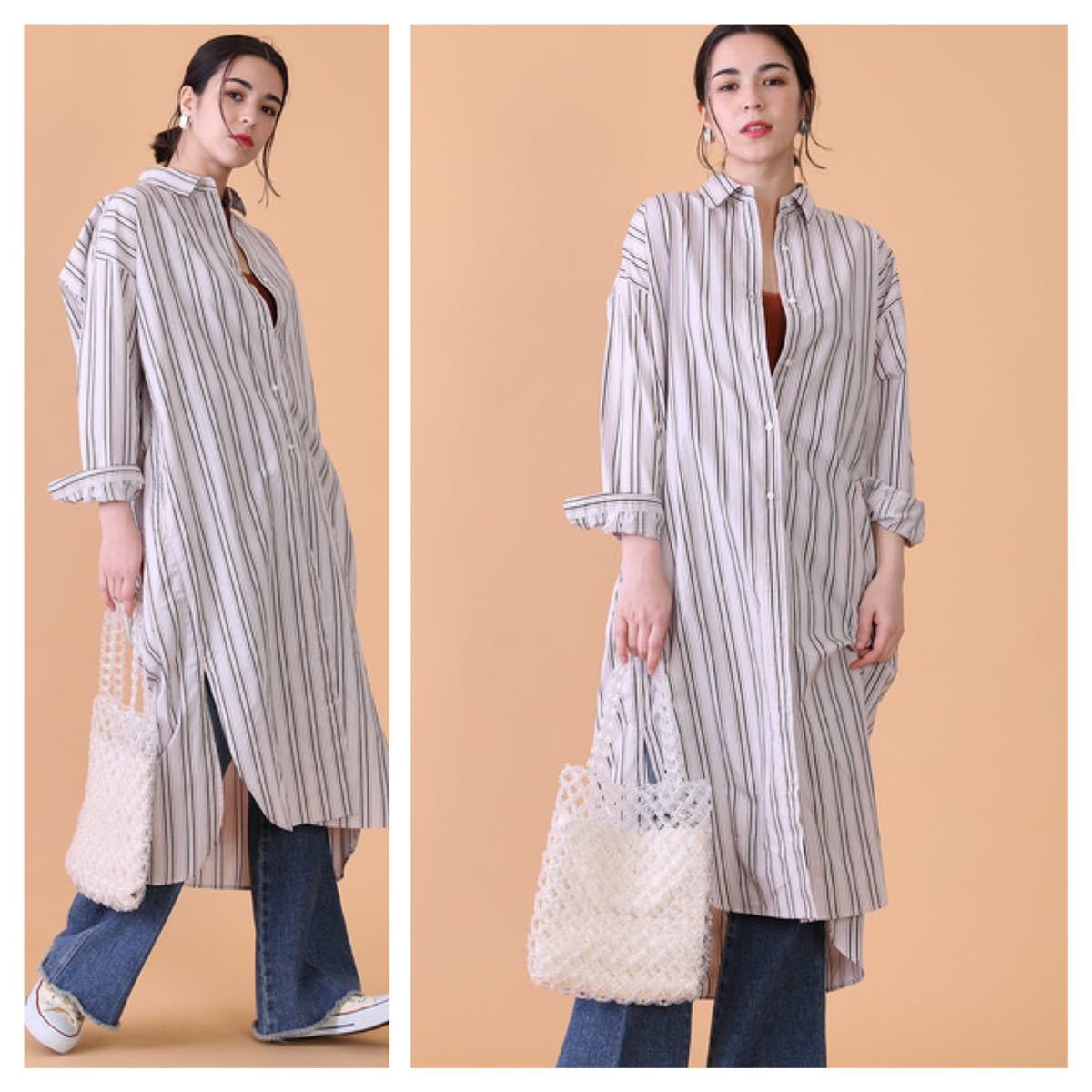 さらっとした生地感で春から夏にかけての時期には羽織りとしても使いやすいアイテムです。ストライプ柄とIラインシルエットで、すっきりとした印象のスタイリングを叶えてくれます。ボリュームのあるボトムとレイヤードすれば今年らしい雰囲気に。ベルトでブラウジングもしやすい柔らかい生地なので、様々なコーディネートをお楽しみ頂けます。