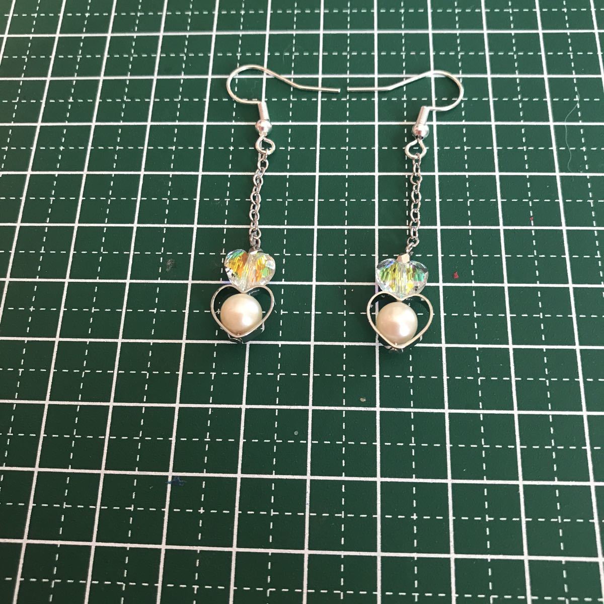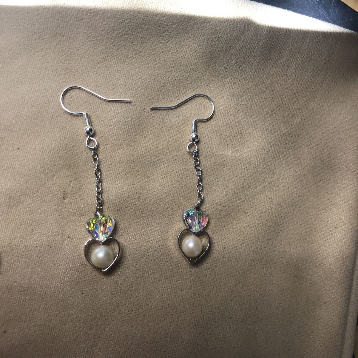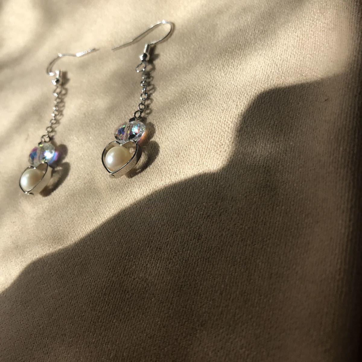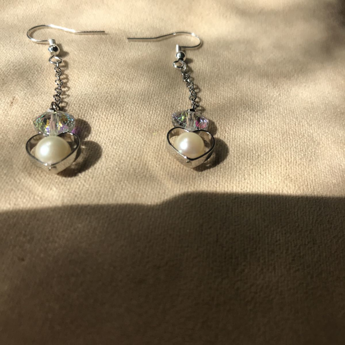6ミリこアコヤ真珠をハートパーツに納めスワロフスキーのハート型と合わせチェーンをつけました。とても可愛いです。フックはステンレスにプラチナメッキしたものを使用しております。