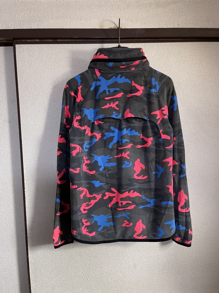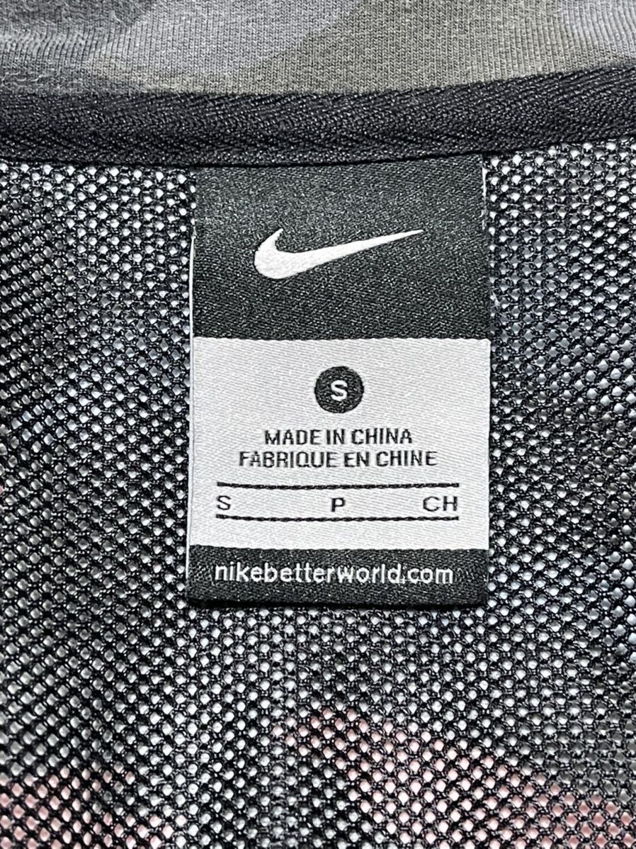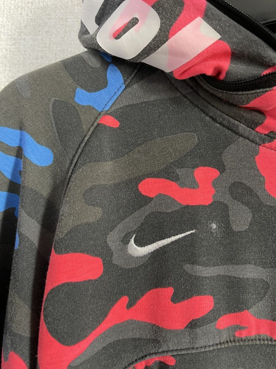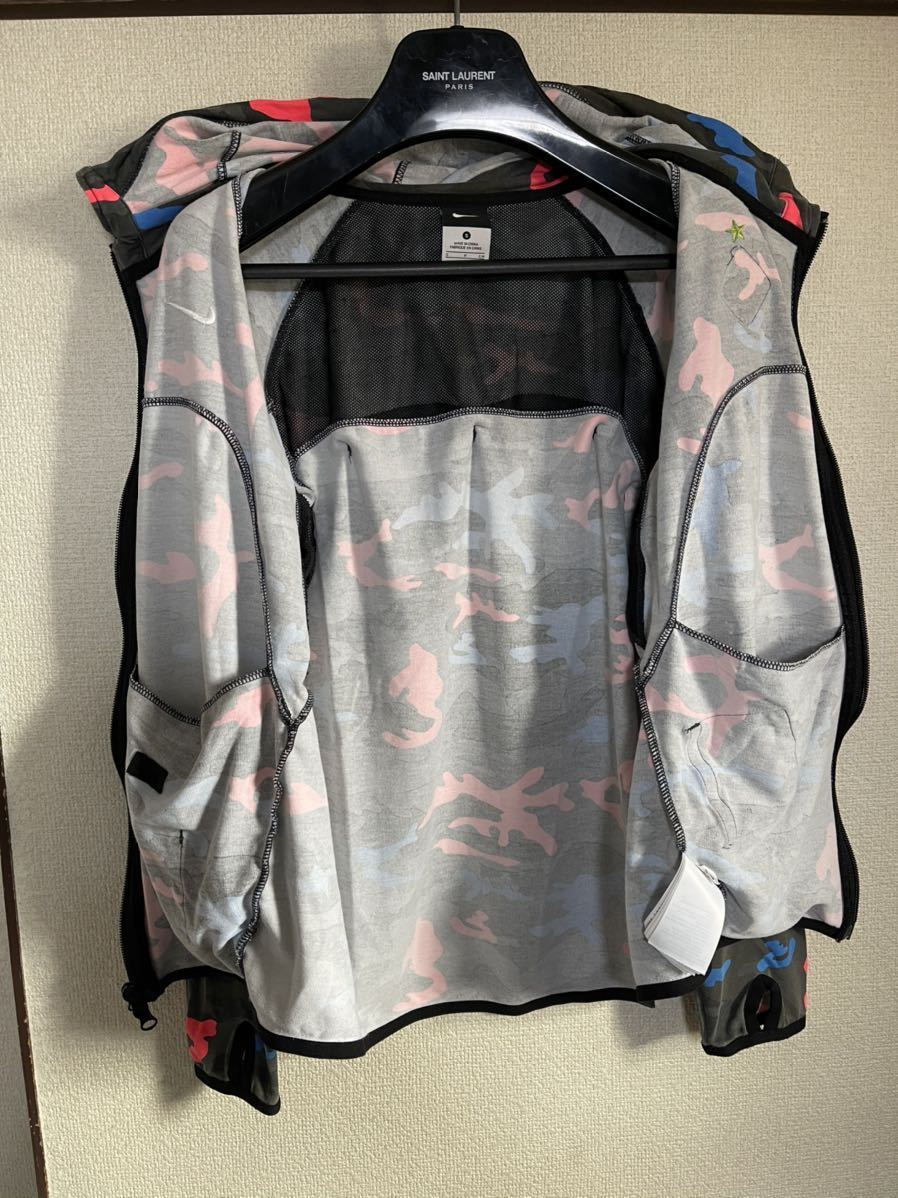 フードのロゴに色移りがございますが、こちらはフードを収納すればわかりません。また襟のドローコードの片側が外れている事とナイキのロゴ付近にやや使用感がございますが着用に問題はなく、まだまだ使って頂ける商品になります。