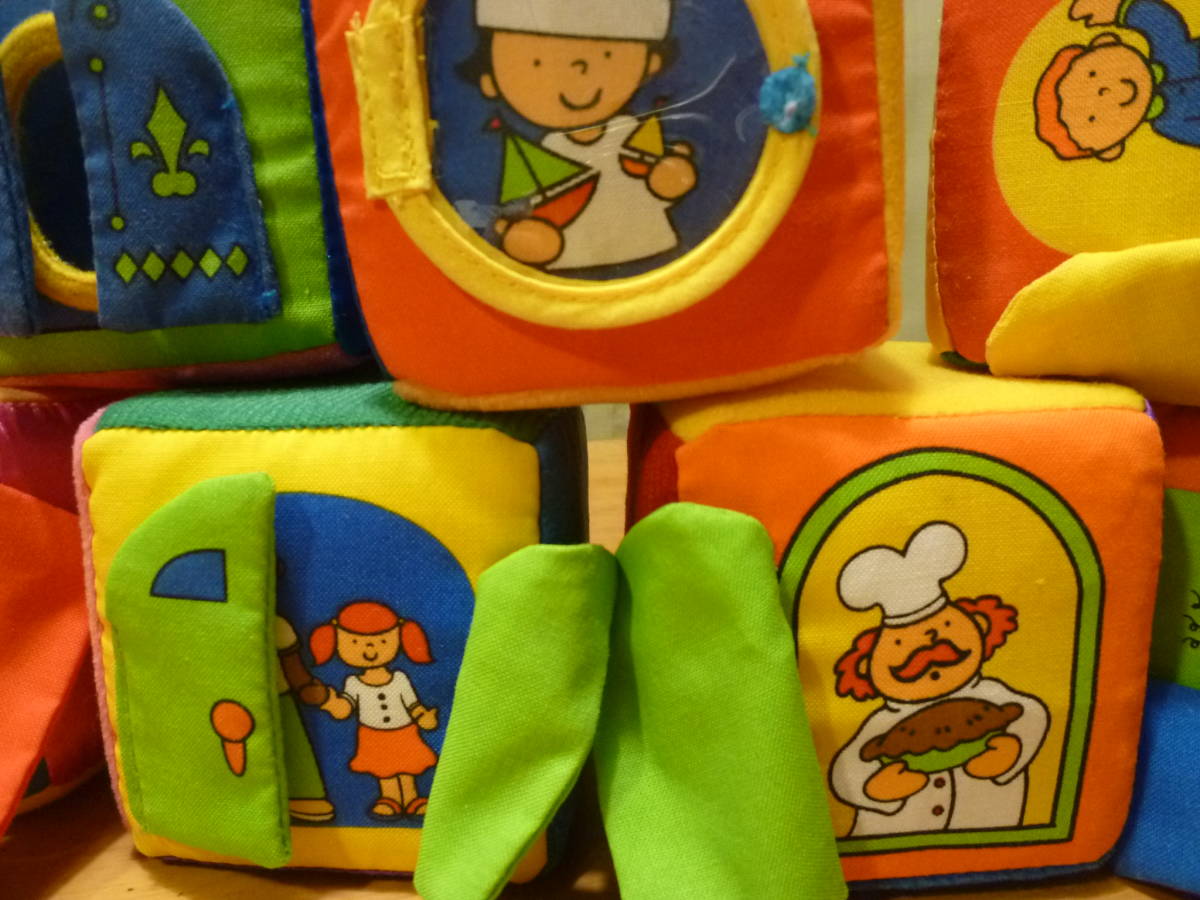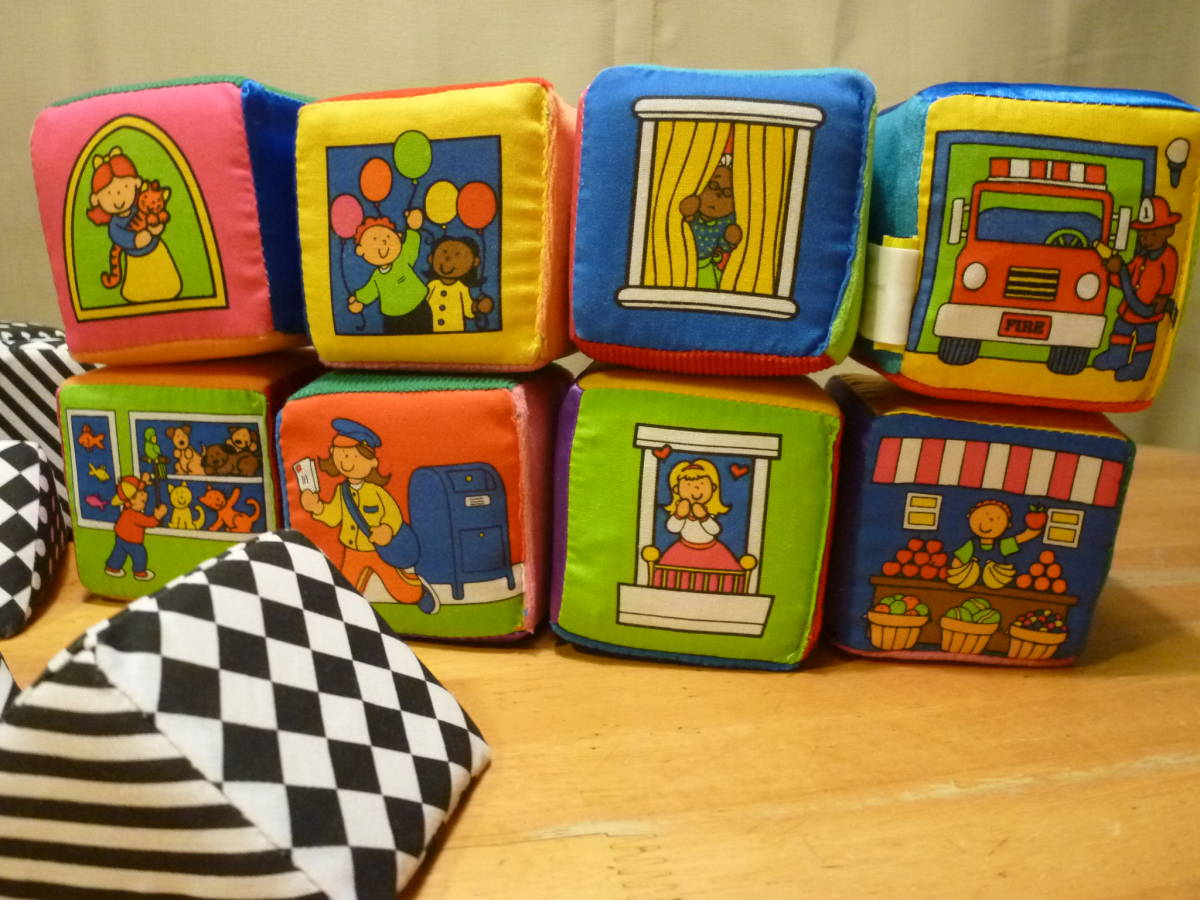 こちらは小さなお子様用の布製ブロックの様です。サイコロ型はクッション入りの一部にはカシャカシャや鈴入りで、表面の布張りも様々な手触り感違いで、その一部はイラスト入りやその反対側には扉や窓が付いていて、それを開くと更に様々な別なイラストやミラーもあります。幾何学模様の三角と合わせて色々組みながら楽しめると思います。