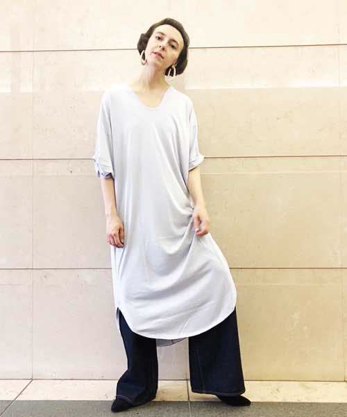 コットン×レーヨンの生地を使用したロング丈のワンピースです。生地にレーヨンが入っているため肌触りが良くさらっと着用頂けます。また、Iラインシルエットが体型カバーになり全体的に引き締まった印象を与えます。両サイドの裾には、スリットが入っておりパンツを合わせて頂いても、一枚で着用頂いても素敵です。