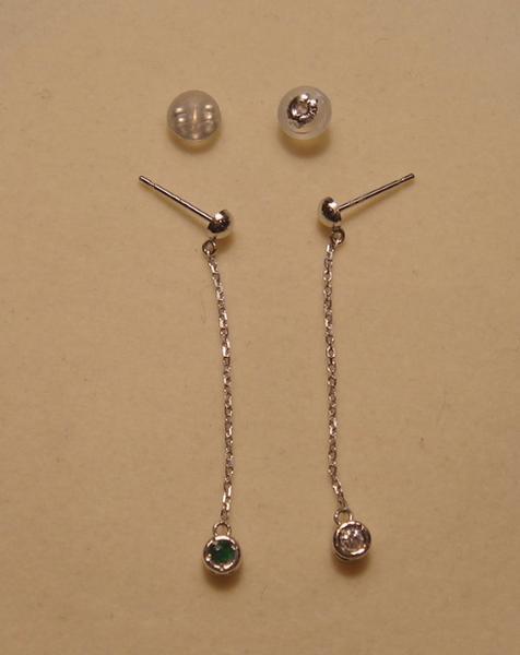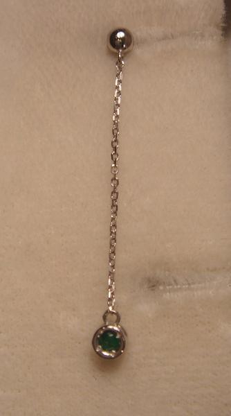 長く揺れるチェーンの先に裏表2色のエメラルドとダイヤが留まっていて、チェーンが揺れるたびにエメラルドの緑とダイヤの白(透明)がチラチラ見え隠れします。