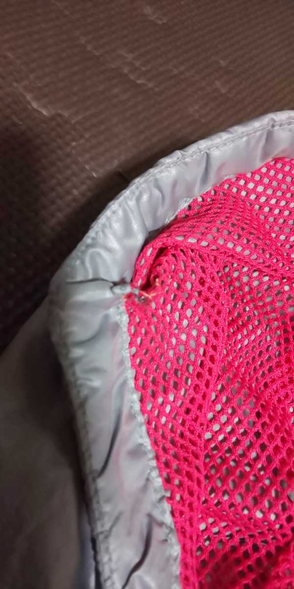 サイズ M 身幅54cm.着丈63cm.フード、裾ピンクゴム入り、裏メッシュ