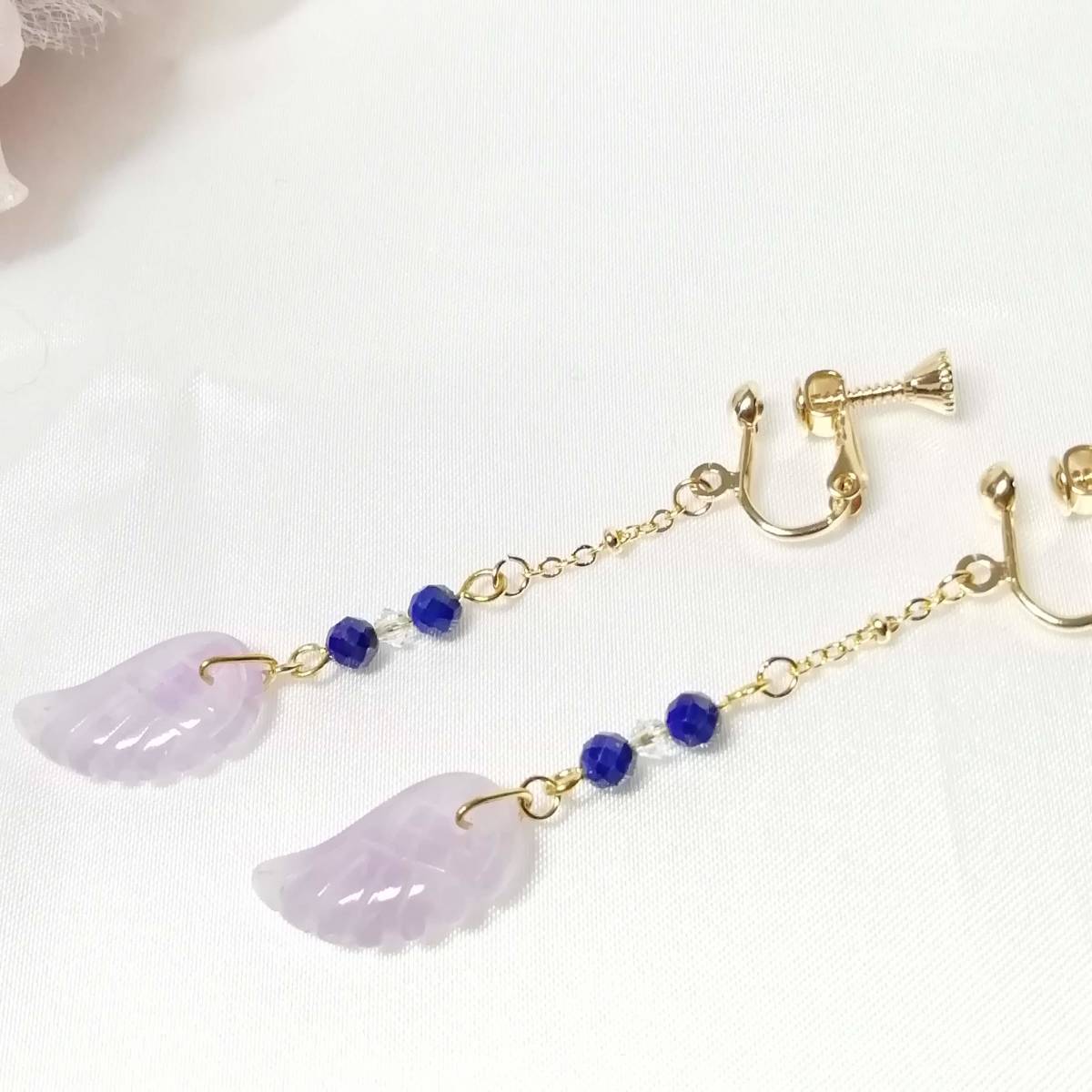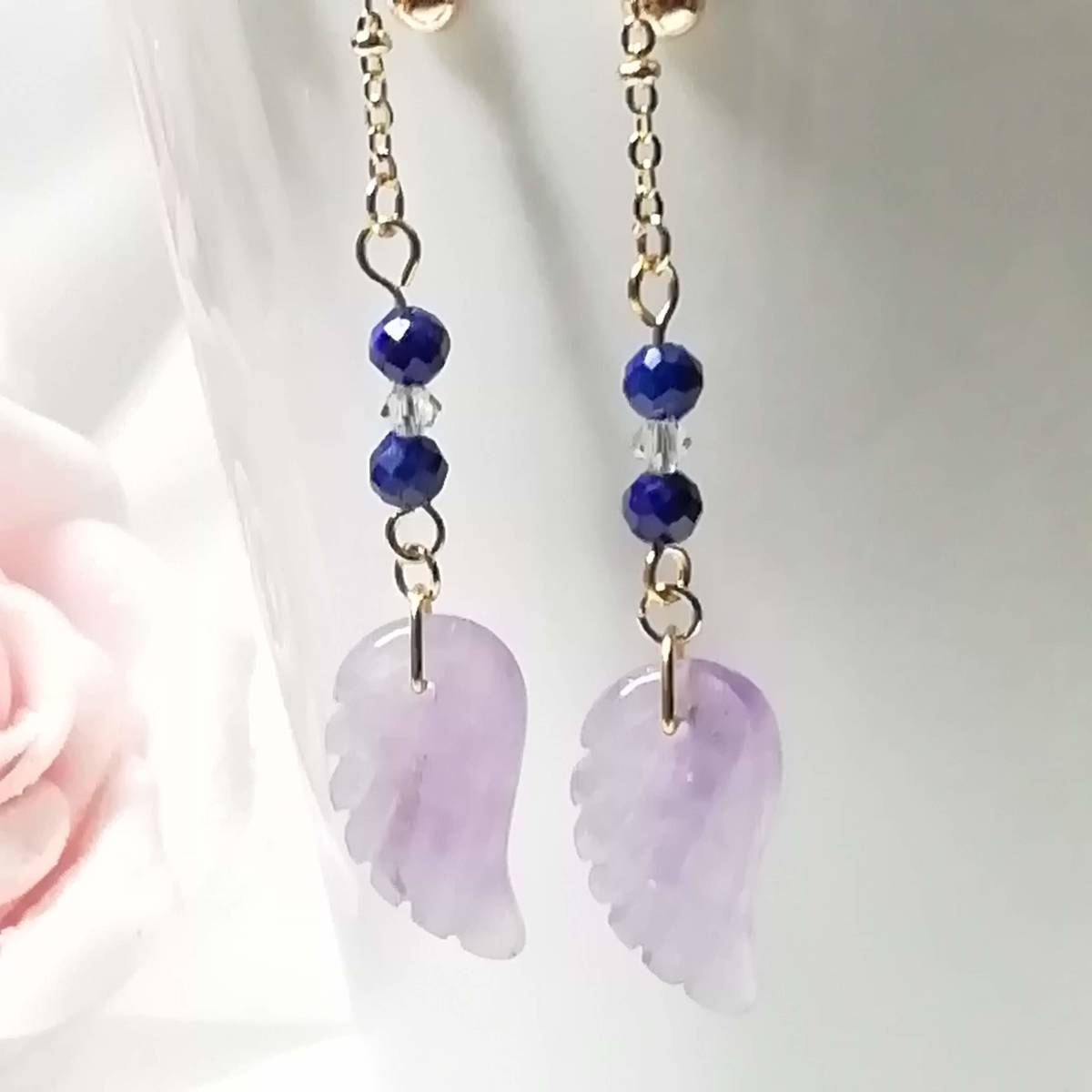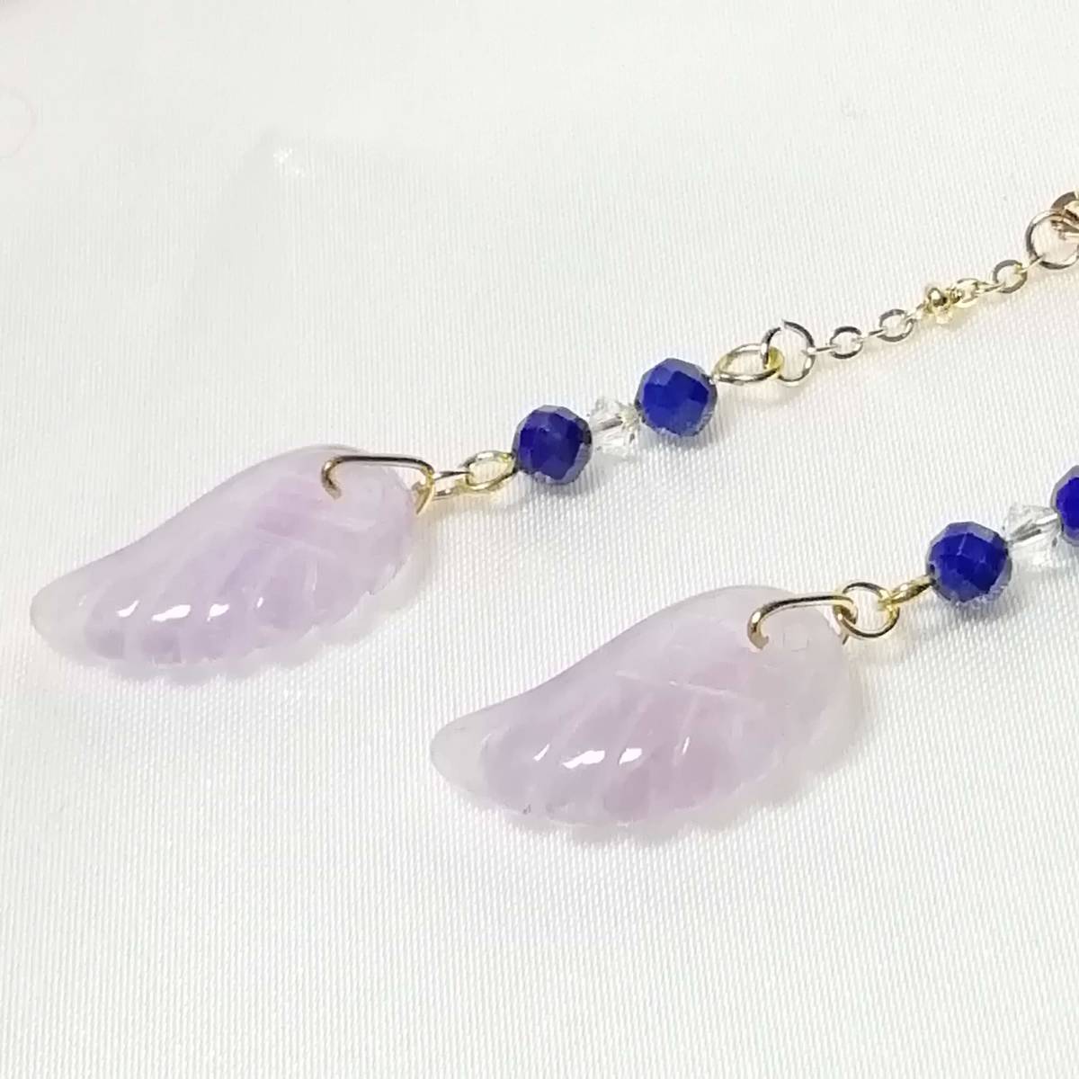 | ★商品内容★ 羽根彫アメジストとラピスラズリのハンドメイドイヤリング★スワロフスキ/上品/天然石/ゴールド/ラメパラピスラズリ/アメジスト/薄紫/紺 羽根状に彫刻した天然石のアメジストと 32面カットのラピスラズリをゴールドパーツでまとめた 上品で個性的な大人の女性らしさを印象付けるイヤリングです*・**☆・**・**☆・** 普段使いはもちろん、オフィスや お洒落のワンポイントなど、様々なシーンでお使い頂けます・**☆・**・**☆***。・. 【素材】 天然石アメジスト天使の羽根18mmx10mm 天然石ラピスラズリ32面カット4mm スワロフスキー5328クリスタル(オーストリア製)3mm k16GP玉付きチェーン カンより垂れ下がる長さは、約5.5㎝です。 Eー783 【天然石豆知識】 ◆◆ラピスラズリ(瑠璃/青金石) ラピスラズリは、古くから世界各地で「聖なる石」と崇められてきました。 その独特な青を「ウルトラマリンブルー」と呼び、金色のパイライトとカットがキラキラと輝き、味わい深い色のコントラストが美しい天然石です。 古代ローマ時代では、恋愛のお守りとしても人気があったようで 日本でも、「七宝」のひとつ「瑠璃」と呼ばれ、「幸運のお守り石」として古くから人々に愛されてきたそうです。 ◆◆アメジスト(紫水晶) アメジストの名は、ギリシア神話に登場する月の女神の女官「アメジスト」に由来するそうです。 日本名では「紫水晶」といいます。 かつて日本では、アメジストの紫色は最も気高い色とされ、大切にされてきたと言われています。 ヨーロッパでは、「真実の愛を表す石」だといわれ、大切にされています。 その為「愛の守護石」とされ、今でも高い人気を誇る天然石です。 2月の誕生石としても有名です。 ★注意事項★ ***~ご購入前に必ずお読み下さい~*** *・*・*落札後について*・*・* *落札後4日以内にお手続き、ご連絡が無い場合は落札者都合で削除致します。 *発送日指定・ご入金の予定が1週間以上先をお考えの方は、入札の前に質問よりご連絡くださいませ。 予めご了承の上、ノークレーム・ノーリターンでお願い致します。 *・*・*商品について*・*・* *一点一点心を込めて作っておりますが、手作りなため多少の歪み等あるかもしれません。 手作りの味わいと、世界で一つだけの作品とお考えいただければ幸いです。 *デリケートな商品ですので、強く引っ張ったりすると破損する事もあります。 お取り扱いにはご注意ください。 *ご覧のPC、スマホによっては画像と実物の色味が多少異なる場合があります。 *基本イヤリング金具は跳ね上げネジ付き金具にて作成しております。 **ご希望によりピアスへの変更も承っております。 【フックピアス…無料/キャッチピアス…別途追加料金120円が必要です】 *その他…樹脂ノンホールピアス(無料)・カン付き樹脂ノンホールピアス(別途追加料金20円が必要です)にも変更をお受け致します。 ~ご注文の際にメッセージ欄よりお申し付け下さい~ 尚、金具変更のご希望が無い場合は、掲載された写真の金具にてお送り致します。 *金属アレルギーや化学物質アレルギーなどへの対応はしておりませんので、ご心配な方はご遠慮下さいますようお願い致します。 *永くご愛用頂くために、ご使用後は柔らかい布等で軽く拭いてください。 *・*・*プレゼント用梱包のご要望もお受けいたします*・*・* *その際は、梱包費用が別途で必要となりますのでご注意ください。 また、ご希望の梱包タイプによって、発送方法が変わりますので、送料が別途必要となります。 プレゼント用梱包タイプ 【袋→100円】 発送方法【クリックポスト(送料無料)】 プレゼント用梱包タイプ 【箱→200円】 発送方法【レターパックプラス(別途520円)】 袋タイプは【合計100円の追加料金が必要です】、箱タイプは【合計720円の追加料金が必要です】となります。 ◆ご希望の場合は、必ず商品ページをウォッチリストに登録した上で落札前に質問にてお問合せ下さい。◆ ◆ご希望を承り次第、一度出品を取り消し、プレゼント用梱包費用、送料などを追加した金額へ変更し、再出品致します。◆ *再出品後に再度検索して頂く手間が省けますため、プレゼント梱包をご希望の場合は必ずウォッチリストへのご登録をお願い致します。 金額変更後の再出品から3日以内に落札されなかった場合、誠に勝手ながら購入する意思がないとみなしまして、元の金額へ修正致します。 また、修正後、再度プレゼント用梱包のご希望のお問い合わせを頂きましても、お断りをさせていただきますのでご注意ください。 ご不明な点がございましたら、落札前に質問よりお願い致します。 ***ご質問について*** *ご購入前にお願い致します。 日中は仕事をしておりますので、ご返事が直ぐに出来ない場合がございます。 出来る限り早い対応を心がけますが、ご了承ください。 また、発送までには、お振込み確認後、翌日の発送を心がけておりますが、仕事の都合により2~3日程かかる場合がございます。(その際