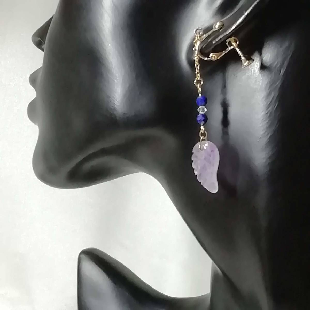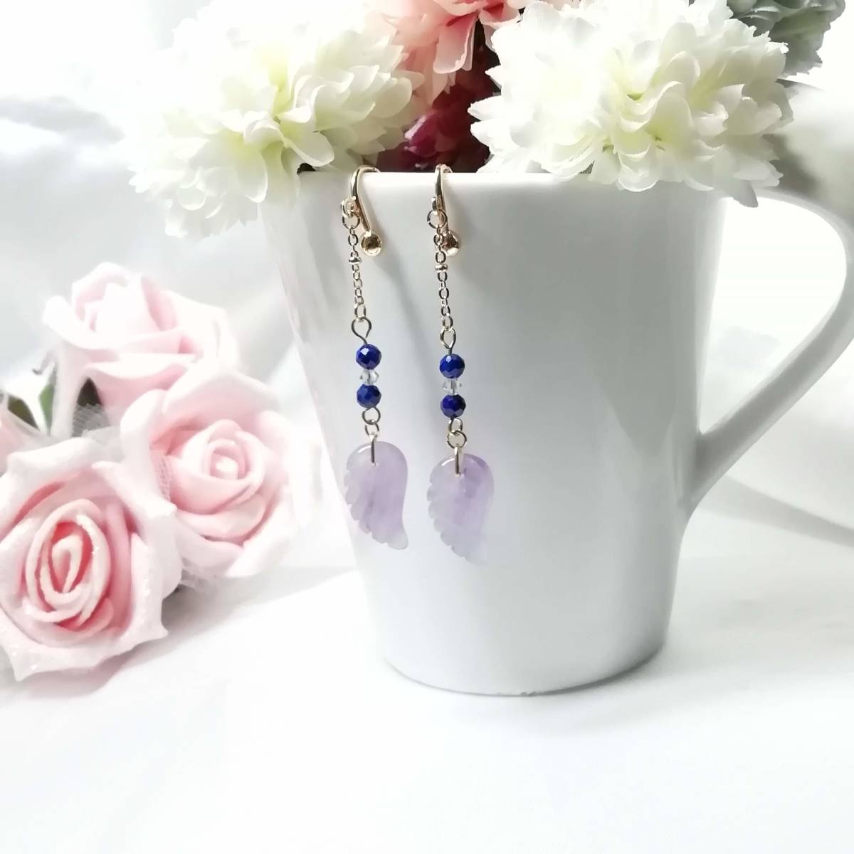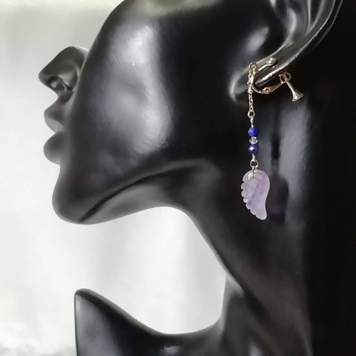 | ★商品内容★ 羽根彫アメジストとラピスラズリのハンドメイドイヤリング★スワロフスキ/上品/天然石/ゴールド/ラメパラピスラズリ/アメジスト/薄紫/紺 羽根状に彫刻した天然石のアメジストと 32面カットのラピスラズリをゴールドパーツでまとめた 上品で個性的な大人の女性らしさを印象付けるイヤリングです*・**☆・**・**☆・** 普段使いはもちろん、オフィスや お洒落のワンポイントなど、様々なシーンでお使い頂けます・**☆・**・**☆***。・. 【素材】 天然石アメジスト天使の羽根18mmx10mm 天然石ラピスラズリ32面カット4mm スワロフスキー5328クリスタル(オーストリア製)3mm k16GP玉付きチェーン カンより垂れ下がる長さは、約5.5㎝です。 Eー783 【天然石豆知識】 ◆◆ラピスラズリ(瑠璃/青金石) ラピスラズリは、古くから世界各地で「聖なる石」と崇められてきました。 その独特な青を「ウルトラマリンブルー」と呼び、金色のパイライトとカットがキラキラと輝き、味わい深い色のコントラストが美しい天然石です。 古代ローマ時代では、恋愛のお守りとしても人気があったようで 日本でも、「七宝」のひとつ「瑠璃」と呼ばれ、「幸運のお守り石」として古くから人々に愛されてきたそうです。 ◆◆アメジスト(紫水晶) アメジストの名は、ギリシア神話に登場する月の女神の女官「アメジスト」に由来するそうです。 日本名では「紫水晶」といいます。 かつて日本では、アメジストの紫色は最も気高い色とされ、大切にされてきたと言われています。 ヨーロッパでは、「真実の愛を表す石」だといわれ、大切にされています。 その為「愛の守護石」とされ、今でも高い人気を誇る天然石です。 2月の誕生石としても有名です。 ★注意事項★ ***~ご購入前に必ずお読み下さい~*** *・*・*落札後について*・*・* *落札後4日以内にお手続き、ご連絡が無い場合は落札者都合で削除致します。 *発送日指定・ご入金の予定が1週間以上先をお考えの方は、入札の前に質問よりご連絡くださいませ。 予めご了承の上、ノークレーム・ノーリターンでお願い致します。 *・*・*商品について*・*・* *一点一点心を込めて作っておりますが、手作りなため多少の歪み等あるかもしれません。 手作りの味わいと、世界で一つだけの作品とお考えいただければ幸いです。 *デリケートな商品ですので、強く引っ張ったりすると破損する事もあります。 お取り扱いにはご注意ください。 *ご覧のPC、スマホによっては画像と実物の色味が多少異なる場合があります。 *基本イヤリング金具は跳ね上げネジ付き金具にて作成しております。 **ご希望によりピアスへの変更も承っております。 【フックピアス…無料/キャッチピアス…別途追加料金120円が必要です】 *その他…樹脂ノンホールピアス(無料)・カン付き樹脂ノンホールピアス(別途追加料金20円が必要です)にも変更をお受け致します。 ~ご注文の際にメッセージ欄よりお申し付け下さい~ 尚、金具変更のご希望が無い場合は、掲載された写真の金具にてお送り致します。 *金属アレルギーや化学物質アレルギーなどへの対応はしておりませんので、ご心配な方はご遠慮下さいますようお願い致します。 *永くご愛用頂くために、ご使用後は柔らかい布等で軽く拭いてください。 *・*・*プレゼント用梱包のご要望もお受けいたします*・*・* *その際は、梱包費用が別途で必要となりますのでご注意ください。 また、ご希望の梱包タイプによって、発送方法が変わりますので、送料が別途必要となります。 プレゼント用梱包タイプ 【袋→100円】 発送方法【クリックポスト(送料無料)】 プレゼント用梱包タイプ 【箱→200円】 発送方法【レターパックプラス(別途520円)】 袋タイプは【合計100円の追加料金が必要です】、箱タイプは【合計720円の追加料金が必要です】となります。 ◆ご希望の場合は、必ず商品ページをウォッチリストに登録した上で落札前に質問にてお問合せ下さい。◆ ◆ご希望を承り次第、一度出品を取り消し、プレゼント用梱包費用、送料などを追加した金額へ変更し、再出品致します。◆ *再出品後に再度検索して頂く手間が省けますため、プレゼント梱包をご希望の場合は必ずウォッチリストへのご登録をお願い致します。 金額変更後の再出品から3日以内に落札されなかった場合、誠に勝手ながら購入する意思がないとみなしまして、元の金額へ修正致します。 また、修正後、再度プレゼント用梱包のご希望のお問い合わせを頂きましても、お断りをさせていただきますのでご注意ください。 ご不明な点がございましたら、落札前に質問よりお願い致します。 ***ご質問について*** *ご購入前にお願い致します。 日中は仕事をしておりますので、ご返事が直ぐに出来ない場合がございます。 出来る限り早い対応を心がけますが、ご了承ください。 また、発送までには、お振込み確認後、翌日の発送を心がけておりますが、仕事の都合により2~3日程かかる場合がございます。(その際