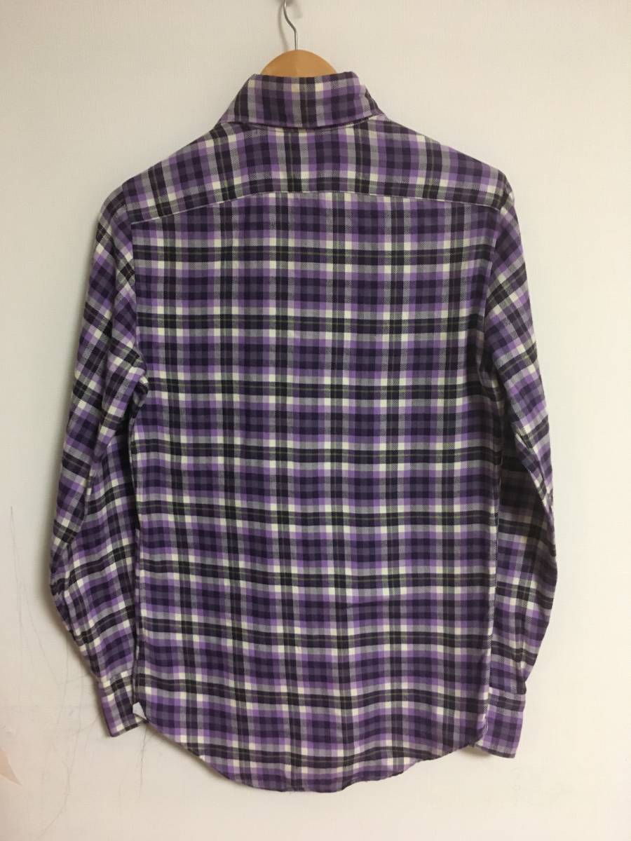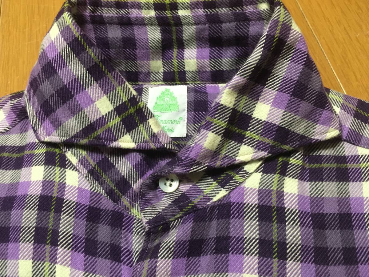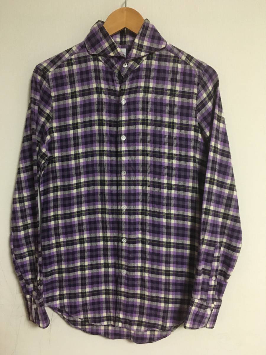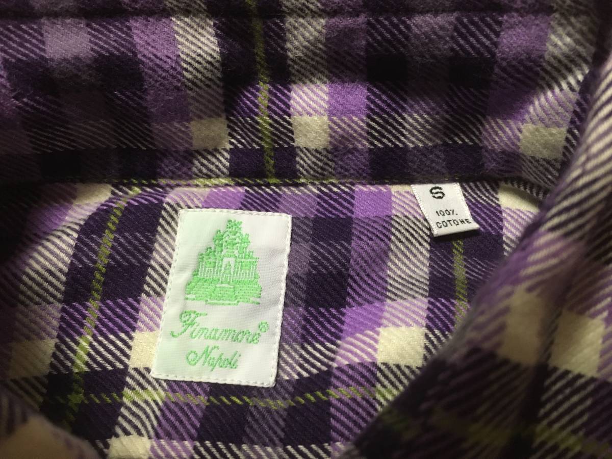★FinamoreフィナモレNapoliナポリ チェック柄 長袖シャツSイタリア製 パープル系 ライトネルシャツ 上質コットン