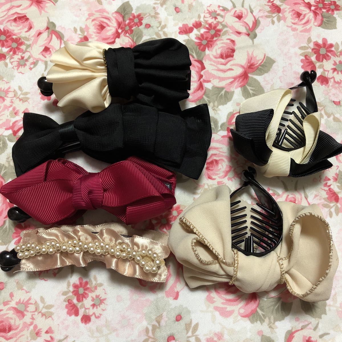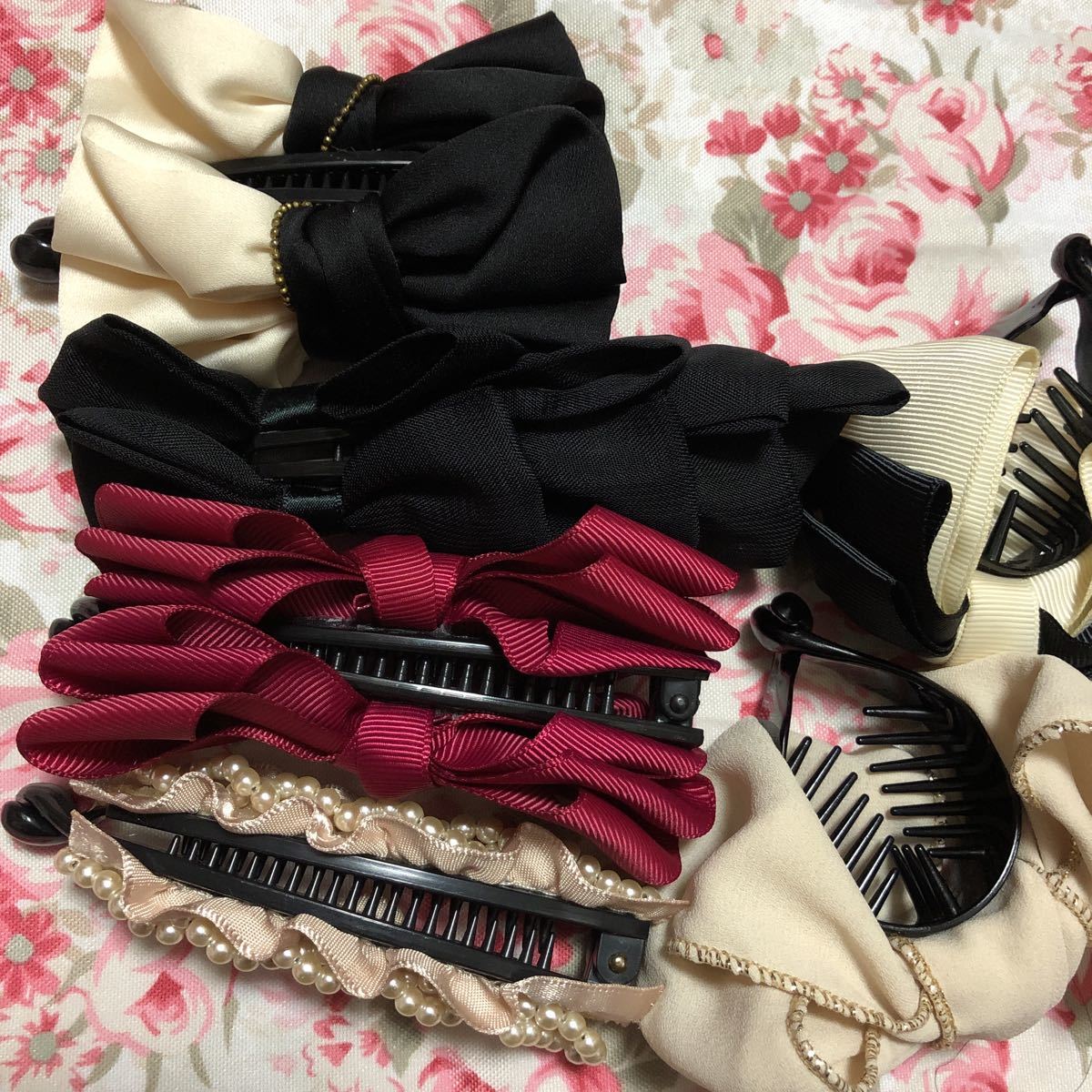 可愛いバナナクリップ4個、ポニークリップ2個セット リボン ベージュ ブラック ワインレッド パールホワイト ヘアアクセサリー