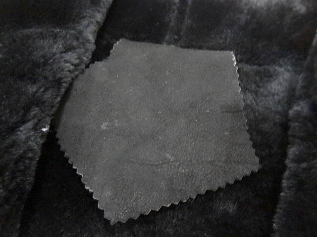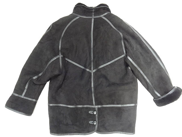 変形の角ばったショールカラーにレザーパインピングデザイン,後の裾にはボタン付きのベンツスリット入りという面白いデザインのコート/ジャケットです。シルエットもとてもよく,素材感もごわごわなものではなく柔らかくストレスの少ないムートン素材です