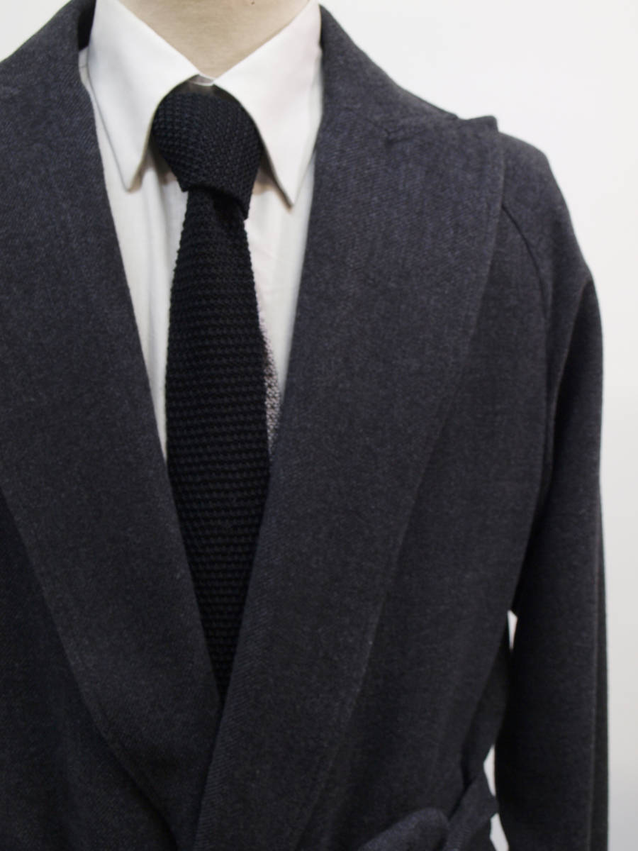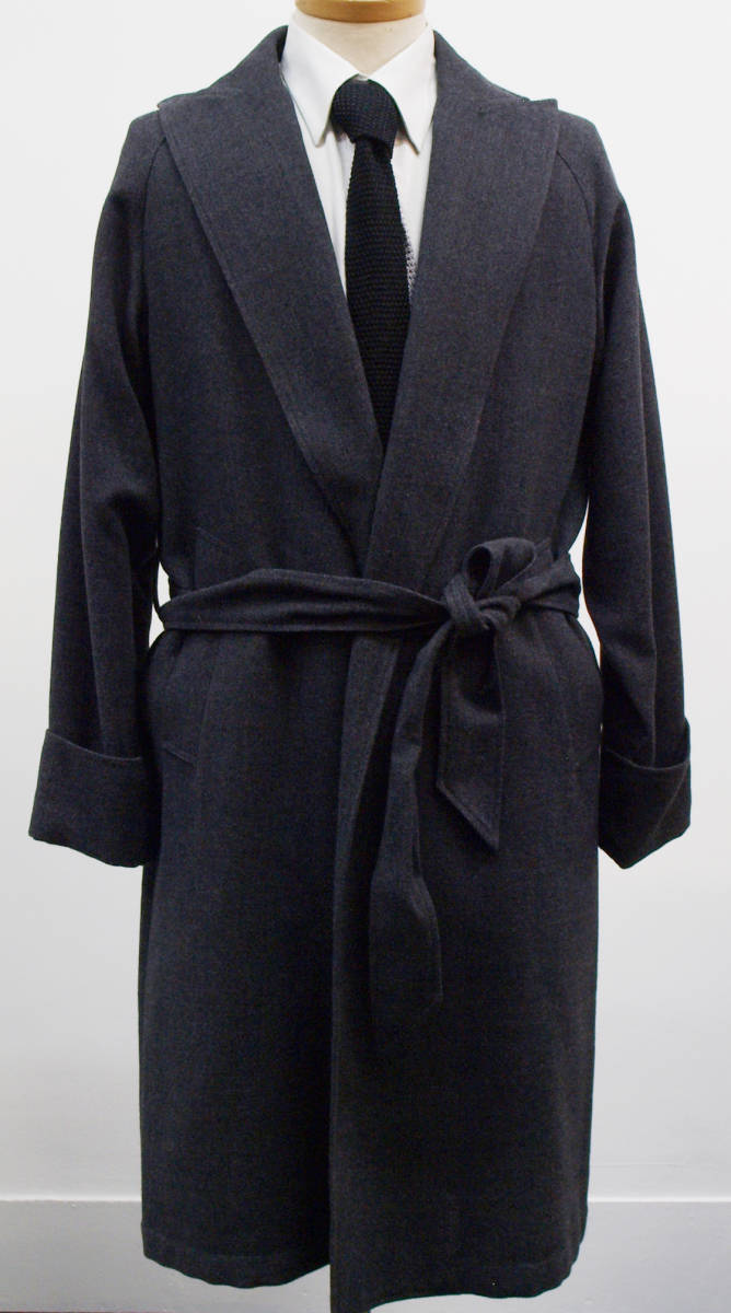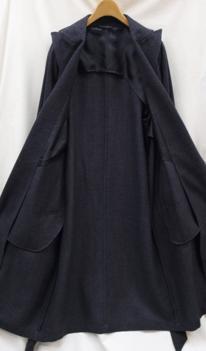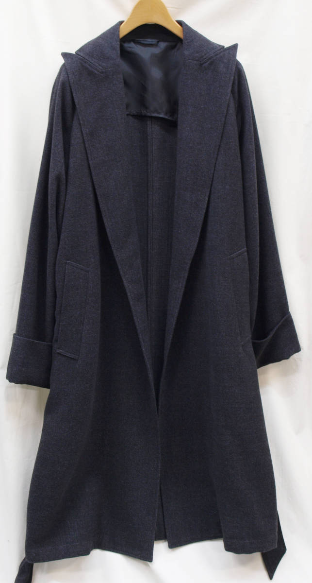【サイズ】 S (Y4号サイズ相当) **** ご着用には問題ございませんが、1着のみのサンプル商品でサイズ、素材表示、洗濯表示等がついておりませんことをご了承下さい。 **** 【外実寸】 肩幅約46cm 袖丈約61.5cm 裄丈85cm 脇下からの袖丈50cm 後ろ着丈106cm 脇下部分54cm 身幅約51cm 【デザイン】 ・ボタンが付いておらずベルトでラップタイプの、チェスターカラーロング丈ガウンコート。 【仕様】 ピークドラペル、ボタンなし、ラグランスリーブ、箱ポケット斜付け2つ、ノーベント、内ポケットなし、ベルトループ2つ、袖口折り返しデザイン、胴裏背抜き、袖裏地有り 【素材】 表地:ウール40% ポリエステル60% 裏地:ポリエステル100% コート生地としてはあまり厚手ではない短起毛したウールブレンド生地を使用しております。 【色】 チャコールグレー 【柄】 無地