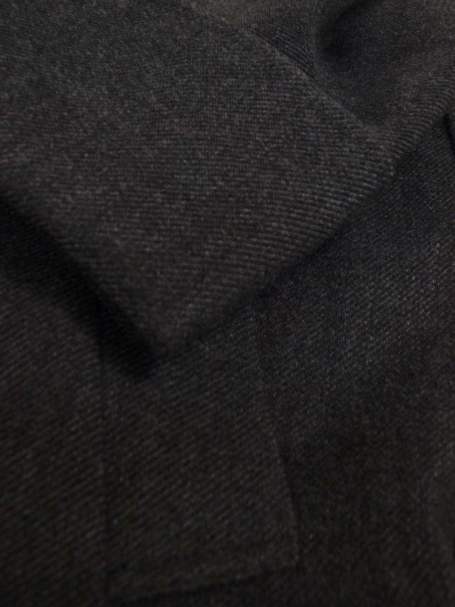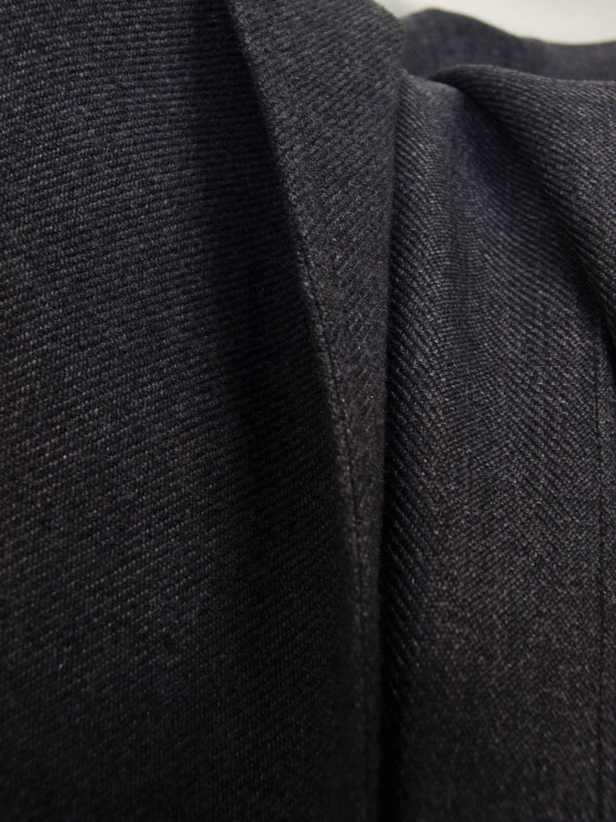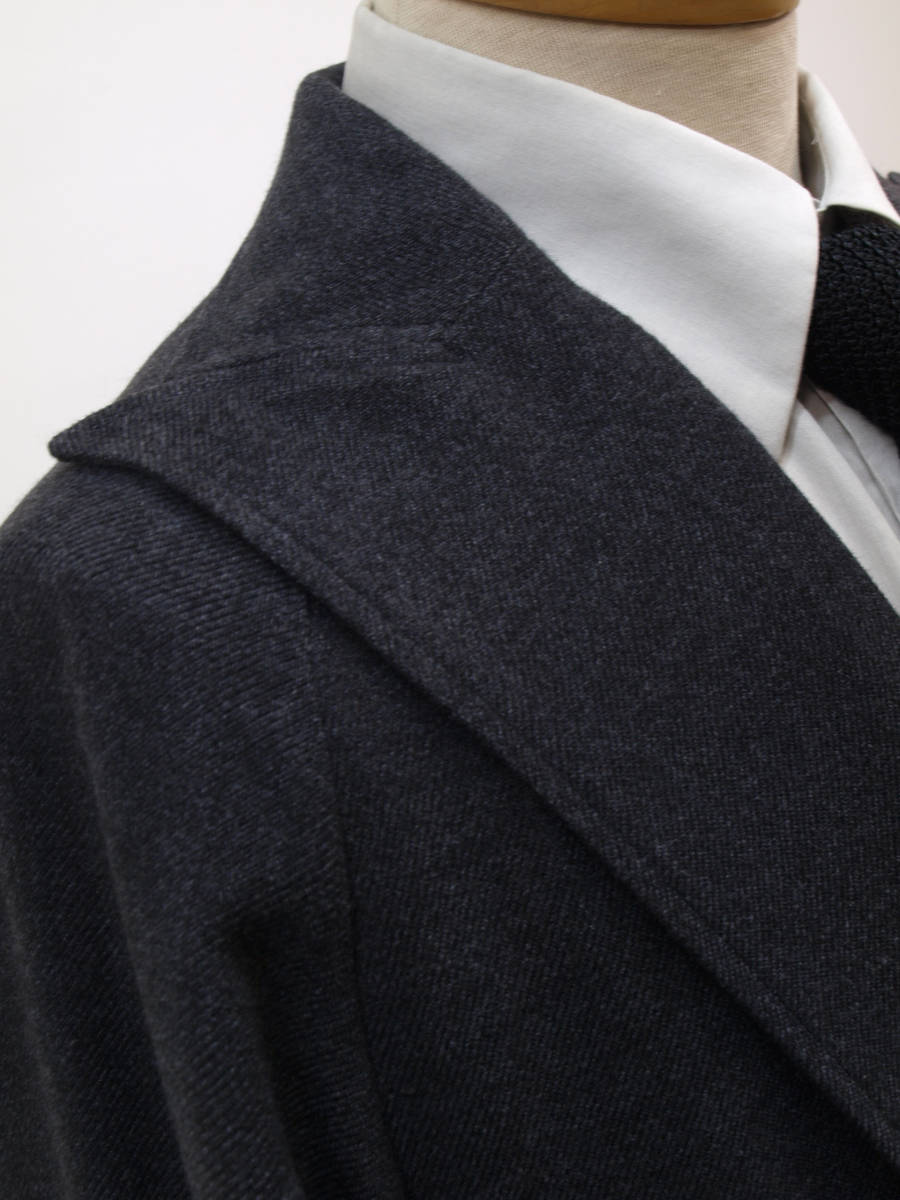 【サイズ】 S (Y4号サイズ相当) **** ご着用には問題ございませんが、1着のみのサンプル商品でサイズ、素材表示、洗濯表示等がついておりませんことをご了承下さい。 **** 【外実寸】 肩幅約46cm 袖丈約61.5cm 裄丈85cm 脇下からの袖丈50cm 後ろ着丈106cm 脇下部分54cm 身幅約51cm 【デザイン】 ・ボタンが付いておらずベルトでラップタイプの、チェスターカラーロング丈ガウンコート。 【仕様】 ピークドラペル、ボタンなし、ラグランスリーブ、箱ポケット斜付け2つ、ノーベント、内ポケットなし、ベルトループ2つ、袖口折り返しデザイン、胴裏背抜き、袖裏地有り 【素材】 表地:ウール40% ポリエステル60% 裏地:ポリエステル100% コート生地としてはあまり厚手ではない短起毛したウールブレンド生地を使用しております。 【色】 チャコールグレー 【柄】 無地
