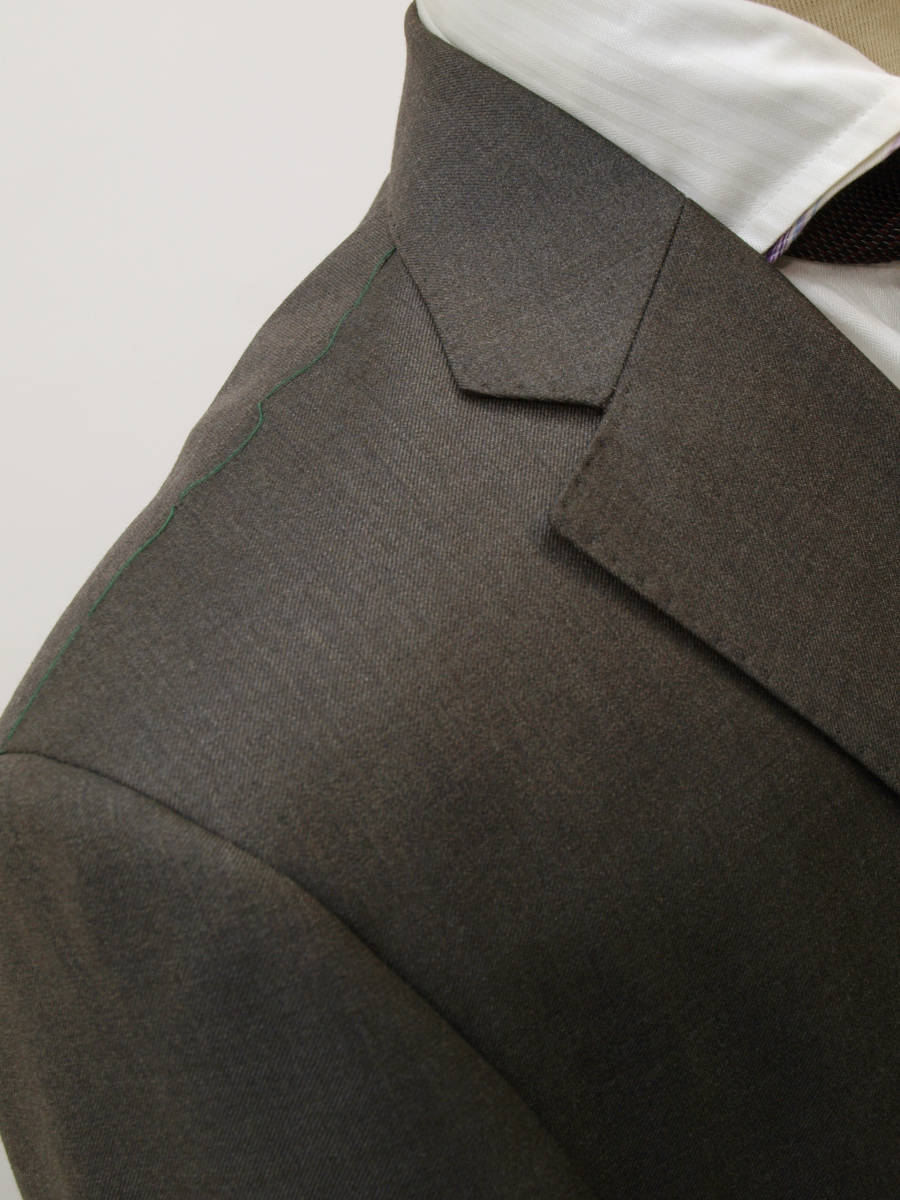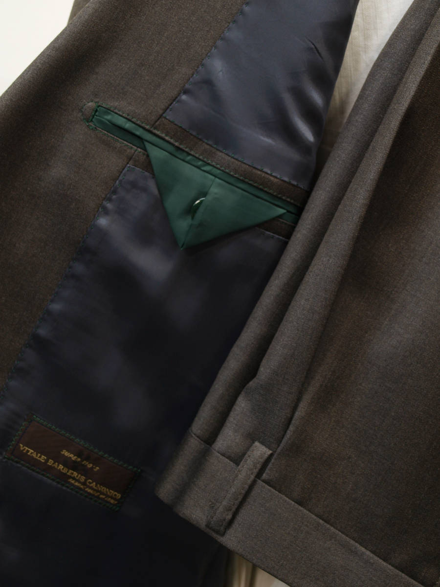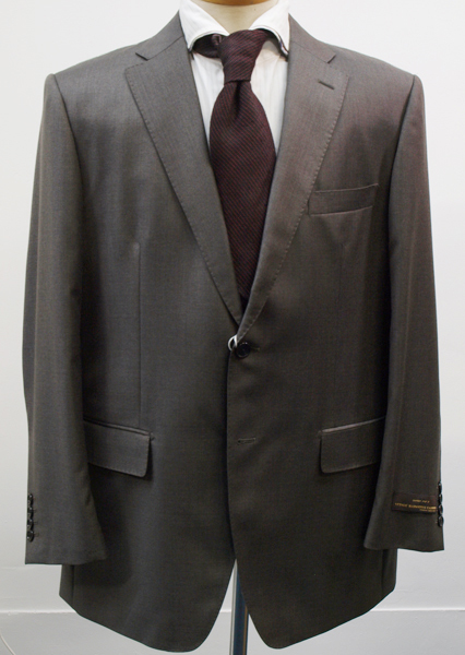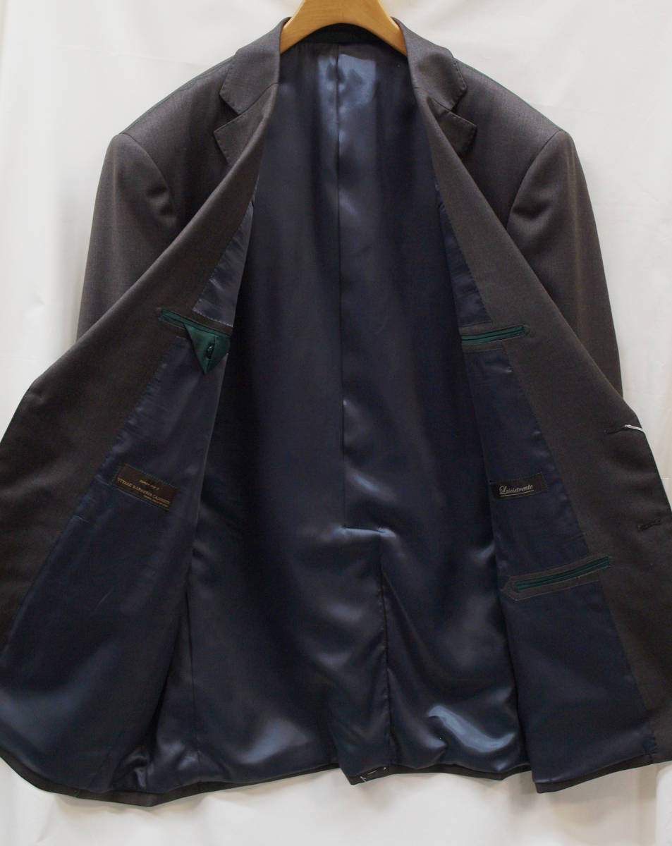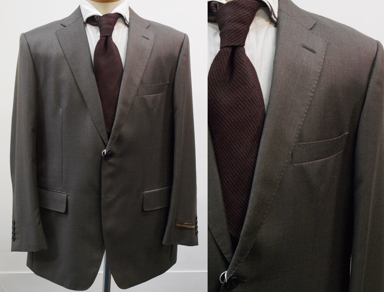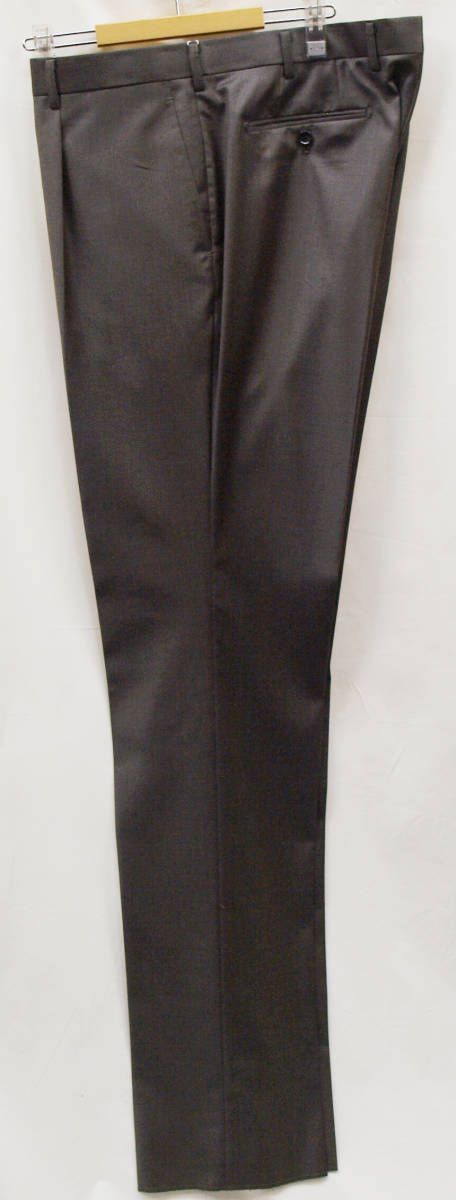 【サイズ】 BB7 (BBLL BE7号相当) 目安の体型 身長175cm~185cm、ウエストサイズ98cm前後 【ジャケット実寸】 肩幅49cm 着丈76.5cm 袖丈62.5cm 脇下部分57cm 身幅54cm 【パンツ実寸】 ウエスト(胴回り実寸)98cm わたり幅35cm 股下10cm部分31.5cm 裾幅22.5cm 脇股上28cm 前股上30.5cm 股下93cm(裾上げしていない 状態/新品) 【素材】 表地:ウール(毛)100% 裏地:胴裏/キュプラ100% 袖裏/キュプラ100% ・イタリア、CANONICO社のSUPER110'S生地を使用 高級イタリア製生地特有のなめらかな触り心地と上品な艶のある上質な素材です。 【色】 あさめの茶色 【柄】 無地 【デザイン】 細すぎずかといってゆとりがありすぎることなく、体型に無理なくきれいにフィットする、シングル2つボタンスーツ、ク ラシコタイプ、新品、裾上げしていない状態です。 ・ジャケットはシングル2つボタンで細身~レギュラーの中間くらい ・パンツは股上は浅くなくウエストラインで履くタイプで、細すぎず、少しだけゆとりをもたせたちょうど良いくらいのす っきりとしたシルエットのスタイリッシュワンタックスラックスです。 流行に左右されないベーシックな無地こそ良いものをというコンセプトで生産されたスーツです。 スラックスが駄目になっても、ジャケットだけでちゃんとしたブレザー単品として使いまわしができます。 秋~冬~春先までの秋冬メインのシーズン対応商品です。 【縫製仕様】 ・ジャケットはシングル2つボタン、ノッチドラペル、襟元等AMFステッチ入り、切台場仕立て、袖口ボタン4つ、セン ターベント、内ポケット3つ(小ポケット1つ含む)、総裏地(秋冬物) ・パンツはワンタック、膝裏当て付き、脇ポケット斜め付け、後ろポケット左のみボタン付き、フロントはファスナーでボ タン&ホック仕様/うちかけボタンあり 使用付属(肩パット/柔らかく薄手、毛芯、ボタン等々)もワンランク上のを使い、細部まできれいな縫製仕立てで仕上が っております。