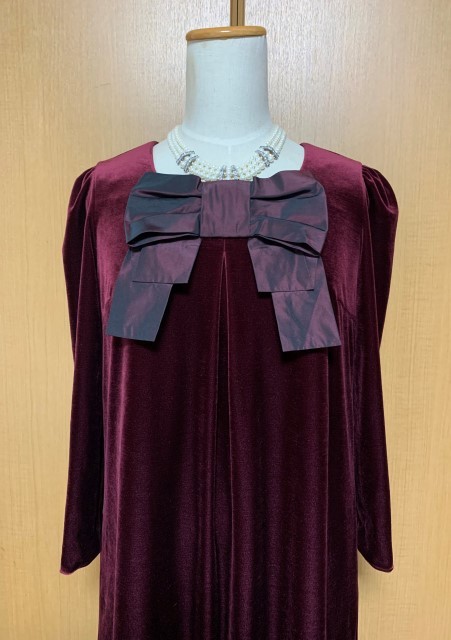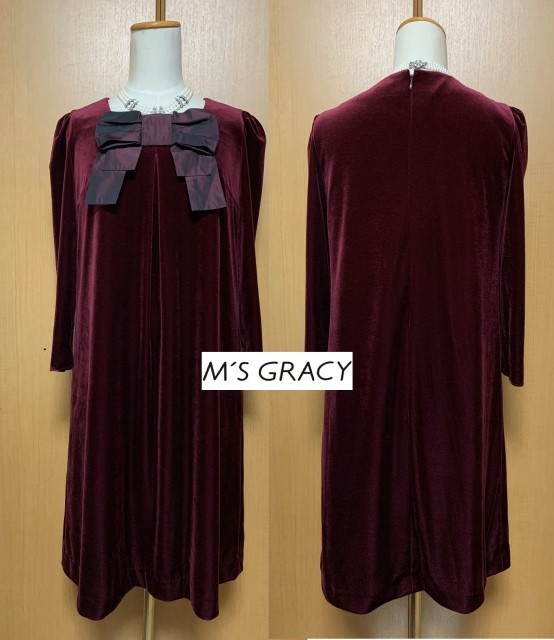 151 M'S GRACY 【エムズグレイシー】 ワインレッド 大きなリボン付き高級ベロア ワンピース