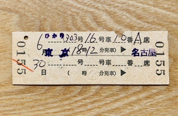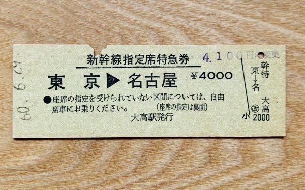 硬券 307【常備券】新幹線指定席特急券 東京-名古屋 昭和60年 大高駅発行 NO.0155