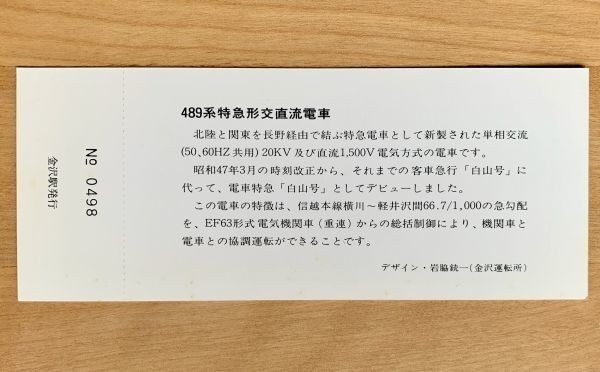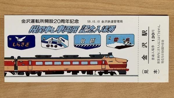 記念切符【見本品】国鉄 金沢運転所開設20周年 機関車&車両展 記念入場券 昭和59年10月10日 No.0498 金沢局 金沢駅発行