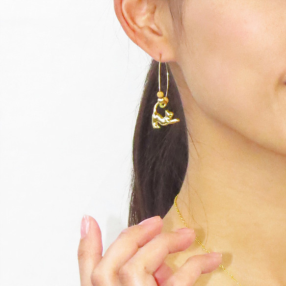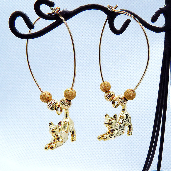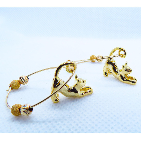 メタルパーツと一緒に猫がゆらゆらと揺れるゴールドのフープピアスです