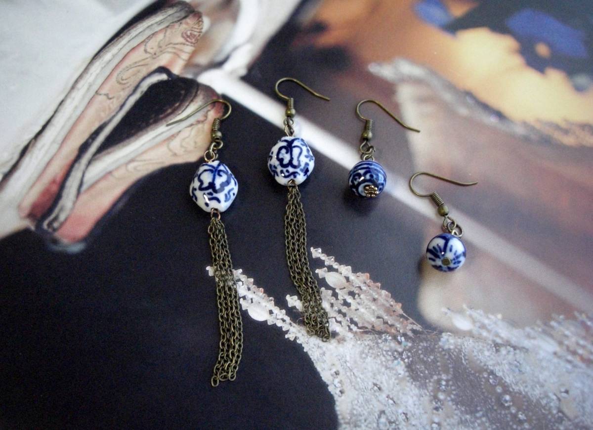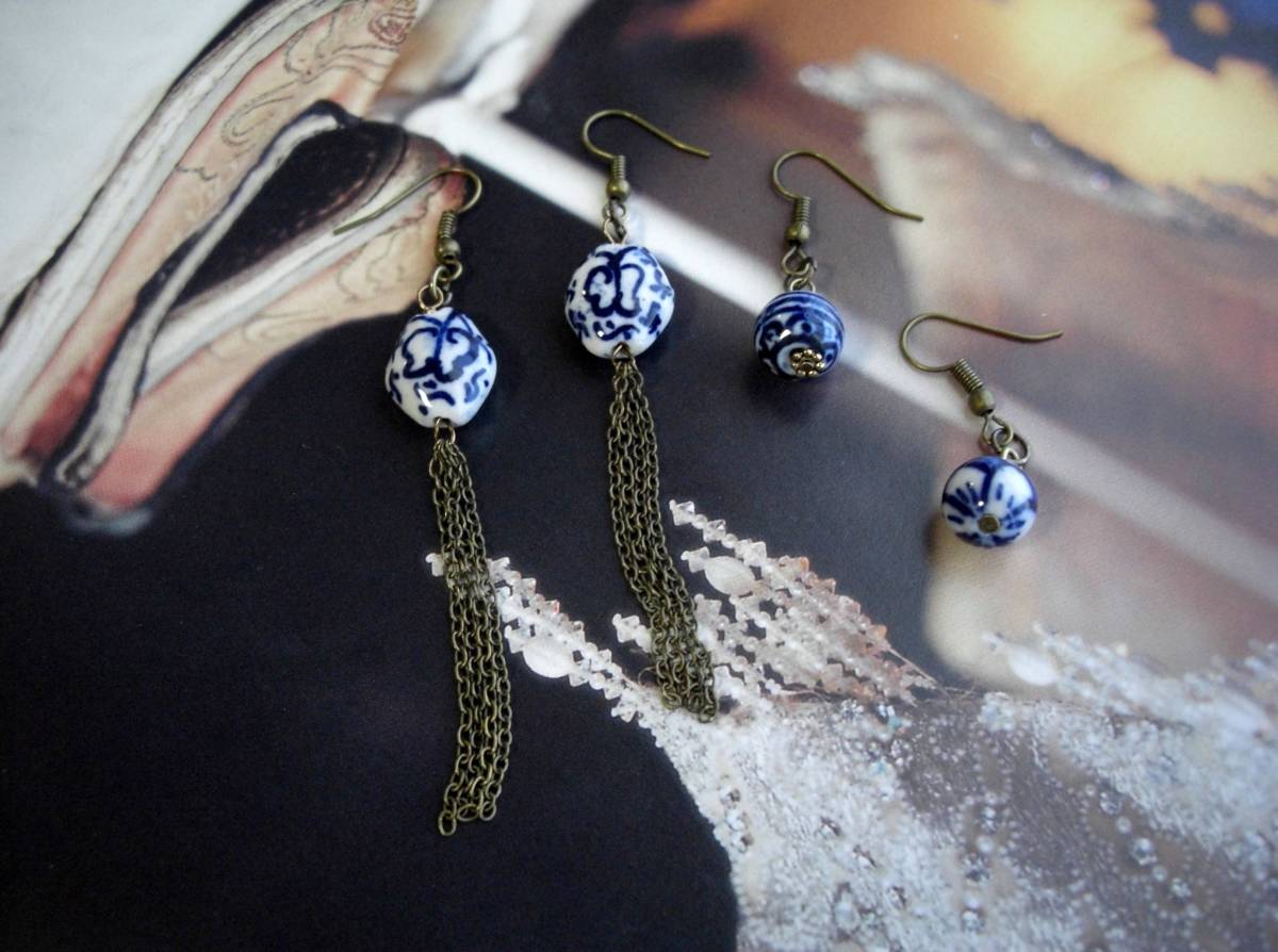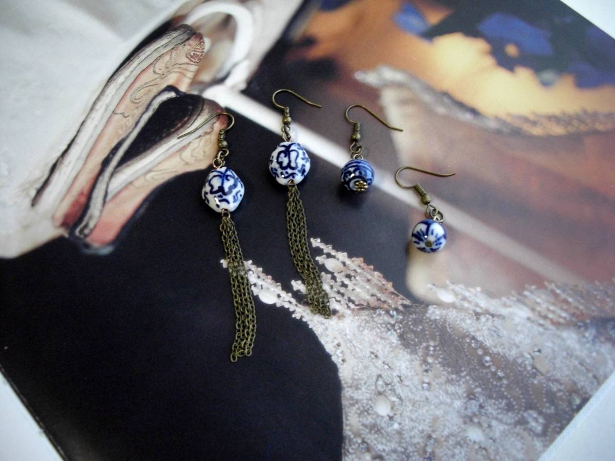 大人色・コレクション・・シリーズです♪藍色に抱かれて・・神秘的な陶器ビーズのピアス、ペア2点セットです♪デザイン違いのペア2点です♪深い藍色が可憐な表情です♪陶器ビーズは10ミリ から16ミリ位の大きさ違い、デザイン違いです♪長さはチェーンを合わせた方が全長9センチ位で10ミリの丸玉の方が全長3・8センチ位です♪イヤリングに変更も出来ます♪お揃いのシリーズも出 品し ています♪シンプルで飽きのこないいつまでも着けられるデザインを考えて作りました!ハンドメイドをご理解頂いてノークレーム、ノーリターンでお願いしま す