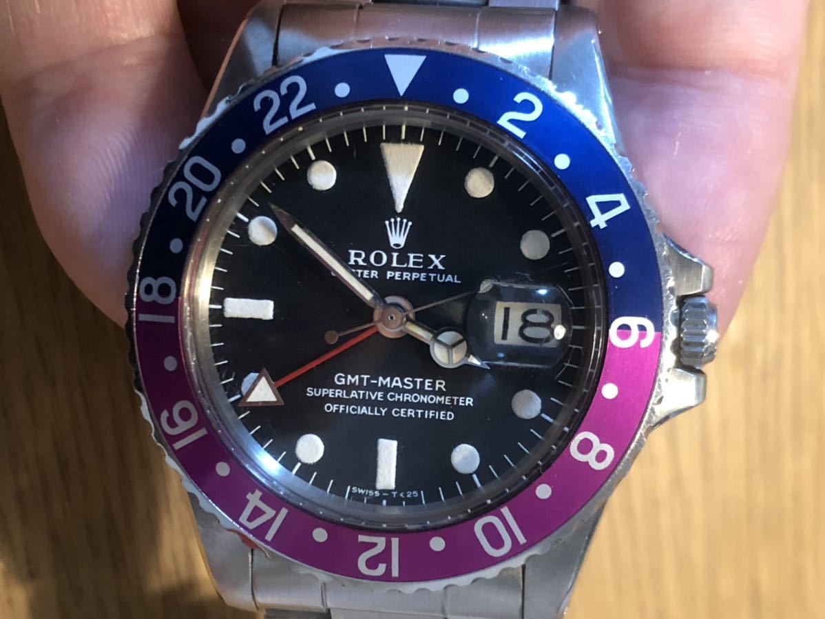 何よりも評価のポイントは、色濃いバイオレットベゼルです。ご興味ある方は色々調べてみてくださいませ。私も日々ネットや店頭にて逸品を探しておりますが、こうしたバイオレットベゼル(1型グレーチェンジダイヤル)などは、まず出てきません。おそらくお店側でもVIPへ一声で売れてしまうからでしょう。私も待ちに待ってようやくお声掛けいただき購入させていただきました。
