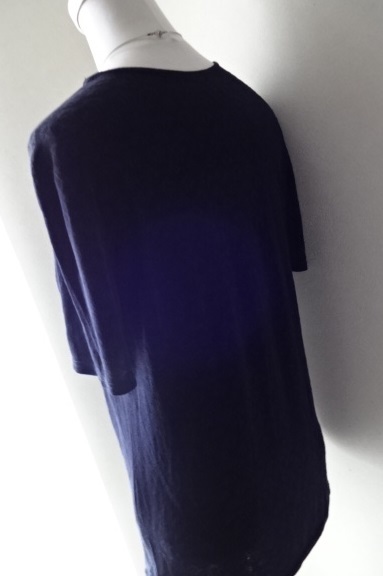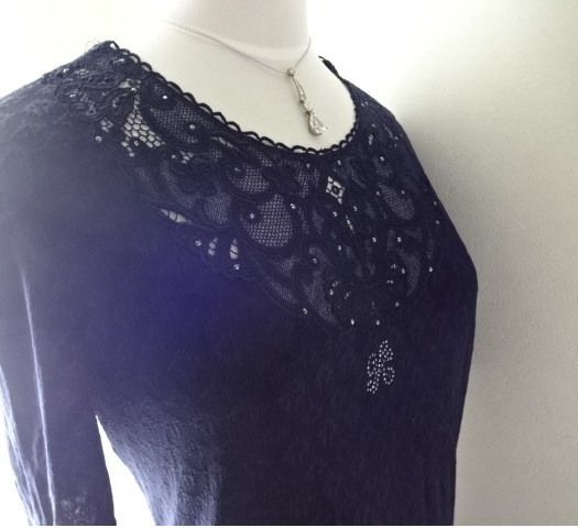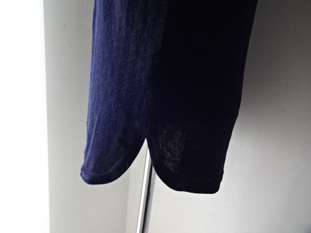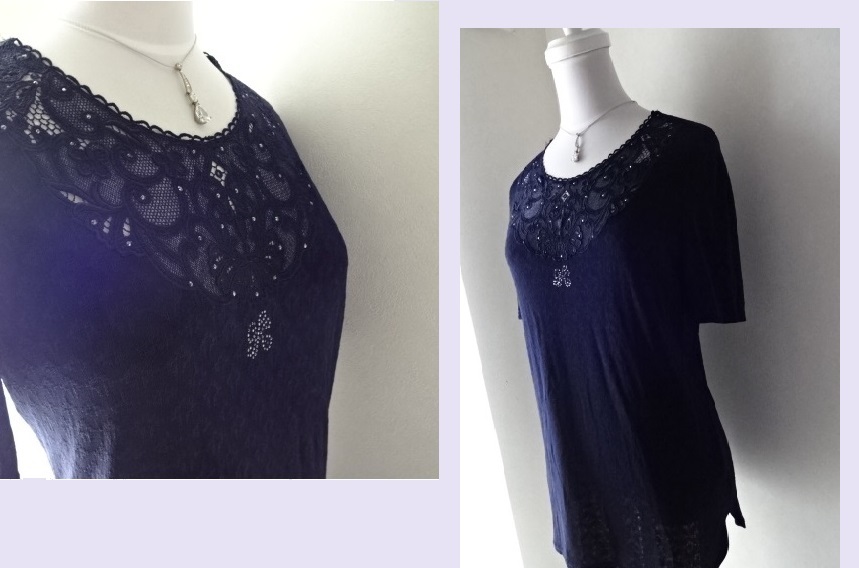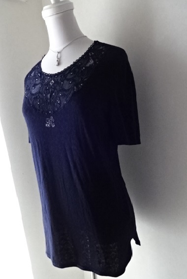 美品・伊太利屋§レース・紺ストーン§ストレッチ・とろみ・トップス・ネイビー・半袖ロングTシャツ・カットソー・ブラウス送料180円