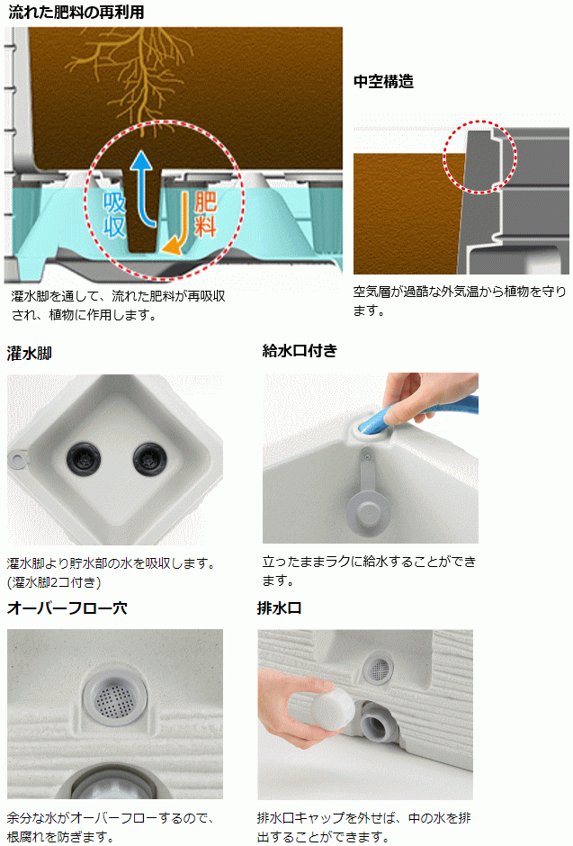 | ・貯水部から必要な水を土に供給 ・底面給水で水やりの頻度を減らし、手間を軽減できます。 ・夏の暑い時期の水涸れを防止します。 | ||||||||||