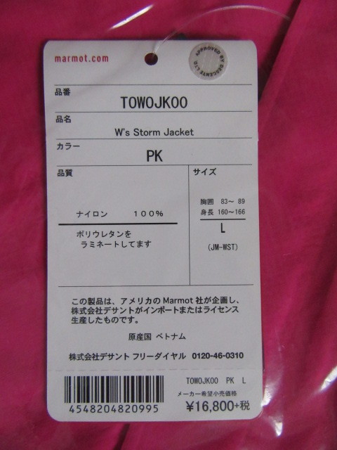 ・Marmot(マーモット)の 防水透湿素材を使用したジャケット、「W's Storm Jacket / ウィメンズストームジャケット、女性 Lサイズ、品番:TOWOJK00、色:PK ピンク」、です。