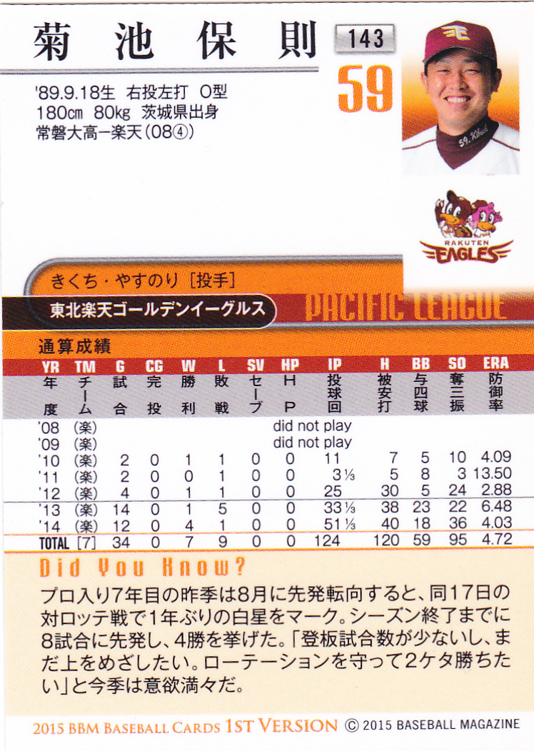 BBM2015ベースボールカード1st 143 菊池保則 茨城県 常磐大高 常磐大学高校 東北楽天ゴールデンイーグルス