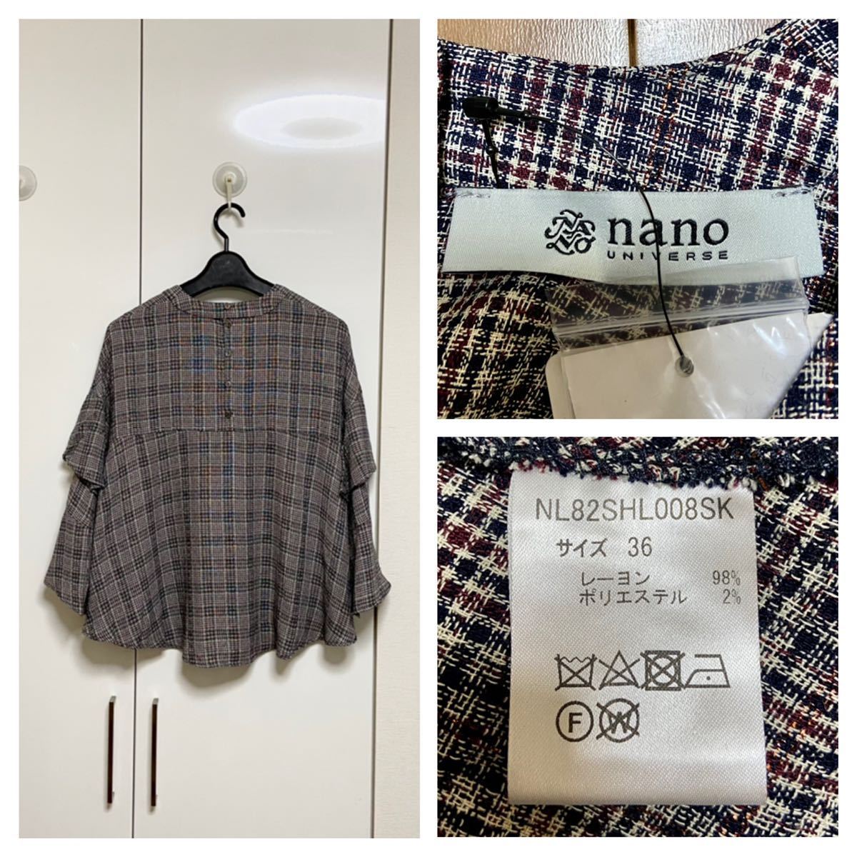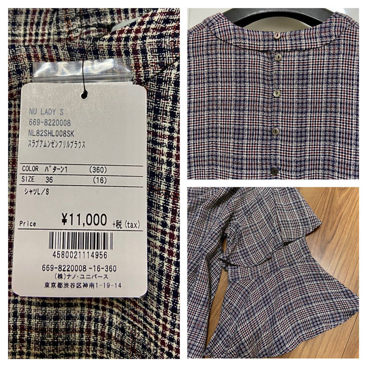 ナノユニバースのスラブアムンゼン フリルブラウス、タグ付きの新品です。保管上の汚れやダメージはありませんが、クローゼット保管ですので神経質な方はご遠慮ください。